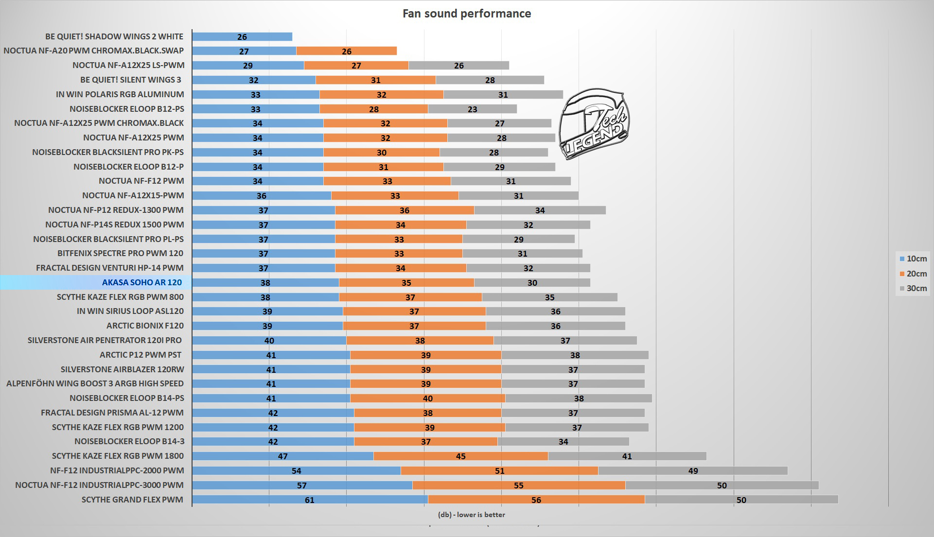 The noise level was measured at three different distances from the fans (10cm, 20cm, 30cm.) the noise was measured with a margin of error of ± 5 db.