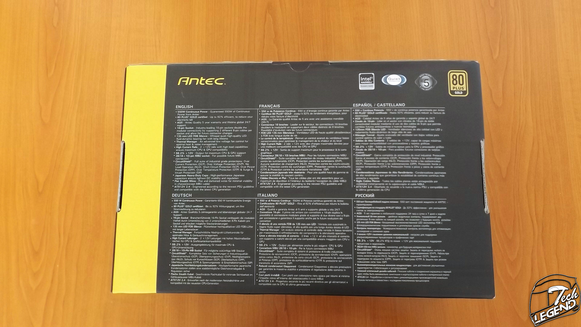 The back side of the box presents the features of the product, on the upper part we find printed several icons of certifications (80 Plus Gold, Nvidia SLI, Haswell Ready, ErP Lot 6 compliance).