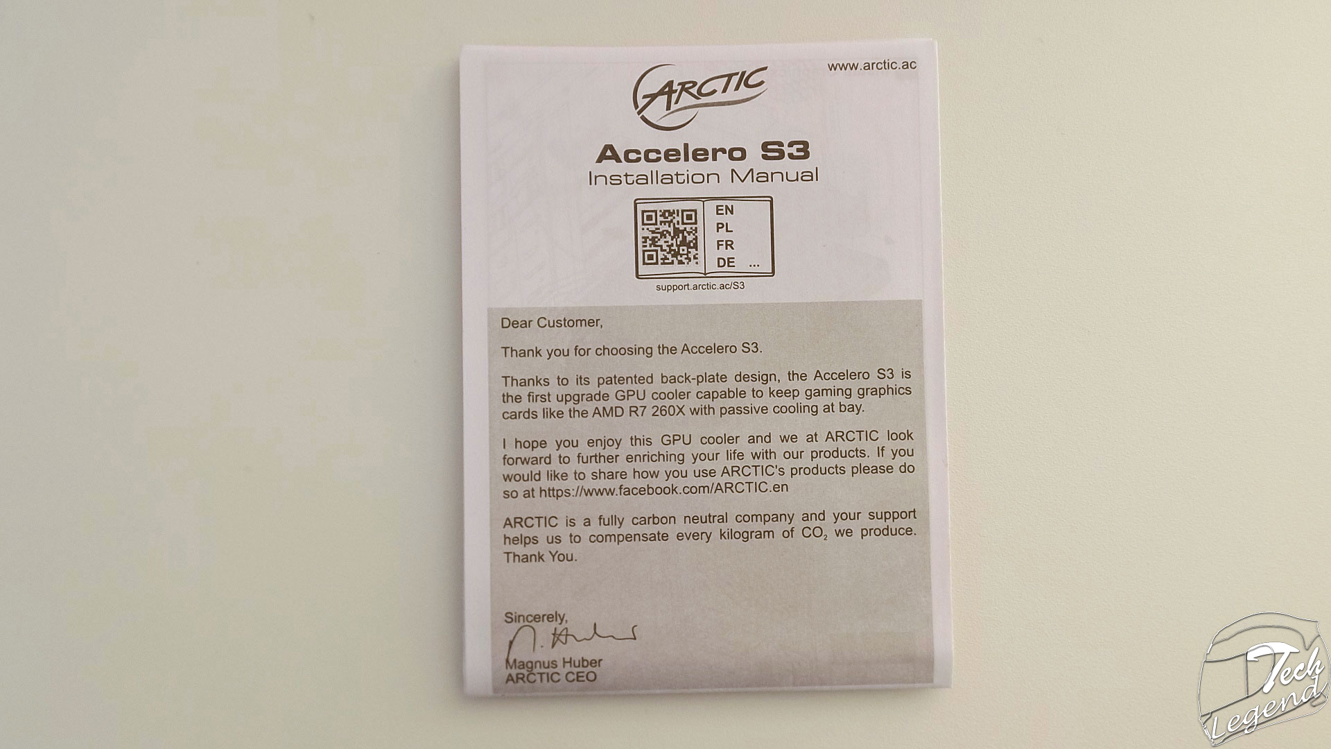 The product comes packaged in a white box with blue accents. The front side of the box shows the product, the name of the product, a QR code and the manufacturer’s name “Arctic”. Here we also have the carbon free green logo.