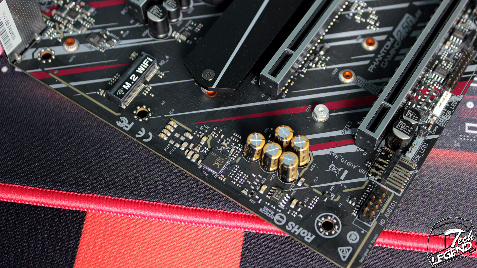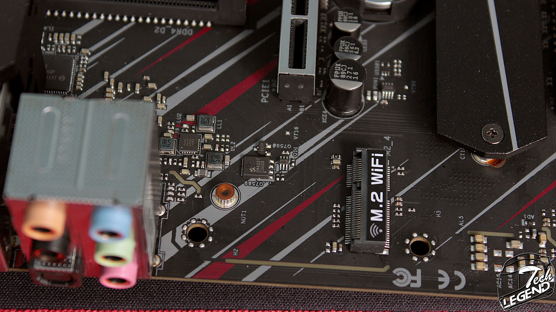 The audio system uses the Realtek ALC1220 chip paired with five Nichicon electrolytic audio capacitors part of the Fine Gold series. The audio components are isolated from the rest of the PCB to reduce interference and static noise; the divide is done by a line that is also illuminated by LEDs when the system is powered.