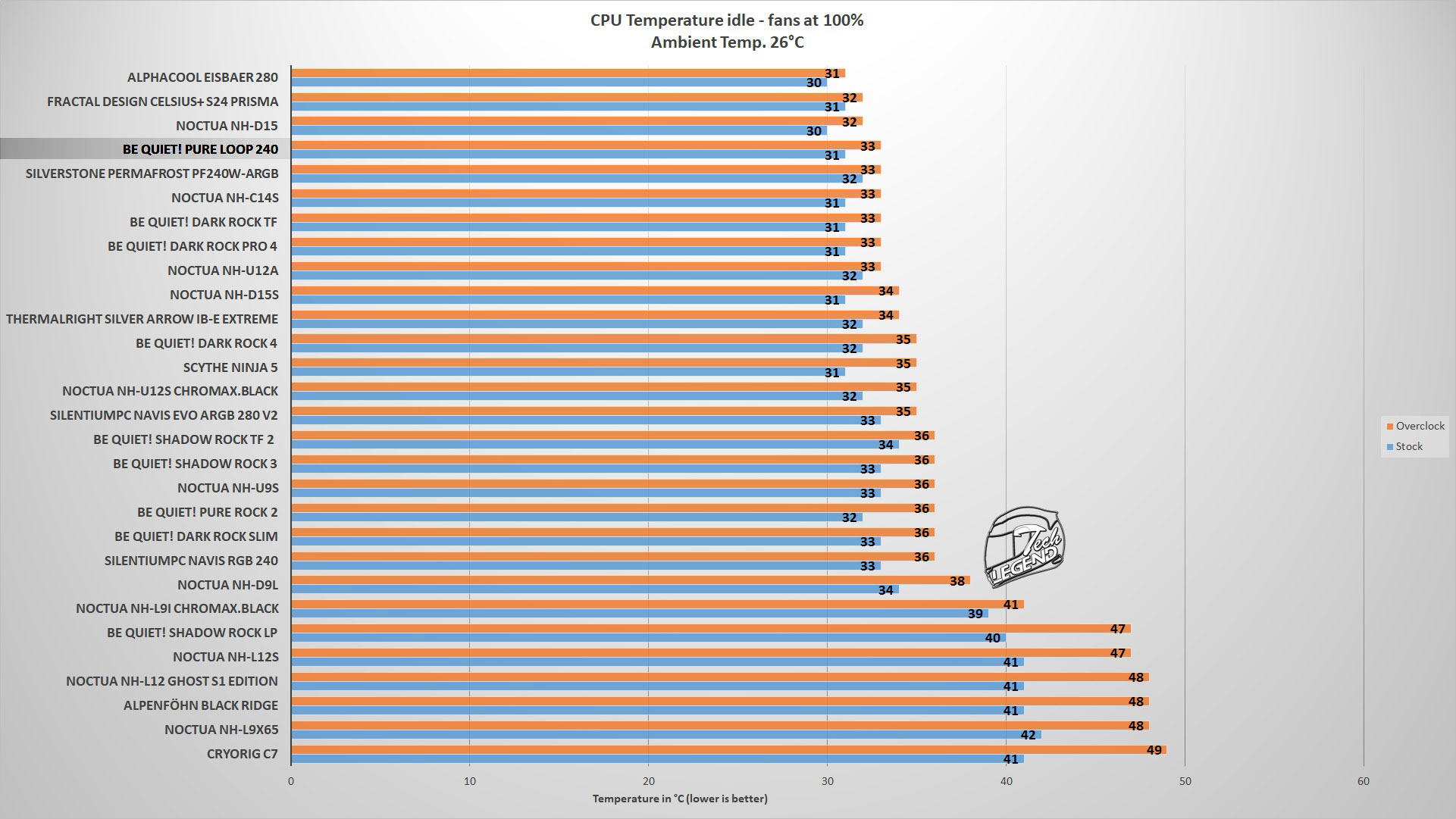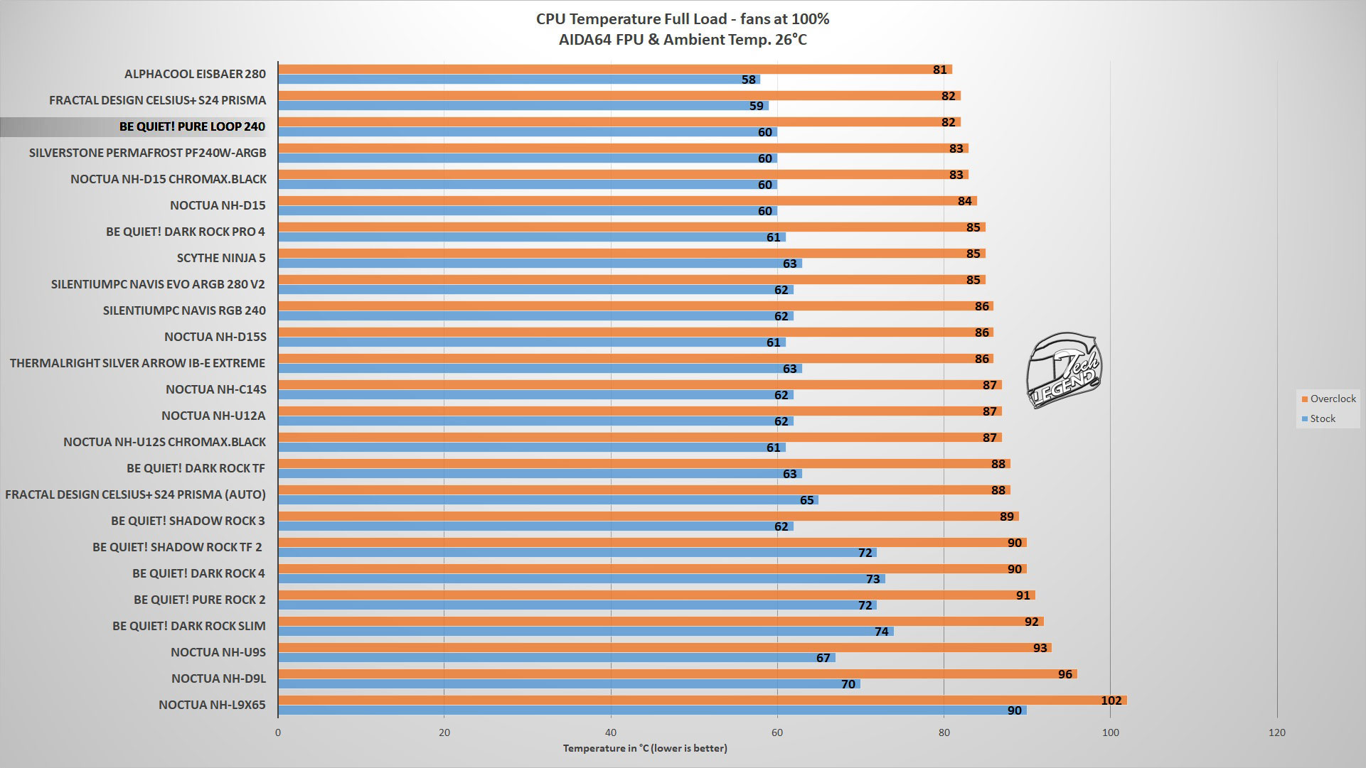 The cooler was tested with the CPU at the default turbo frequency of 4.9 GHz and overclocked to 5 GHz with a core voltage of 1.261 V.