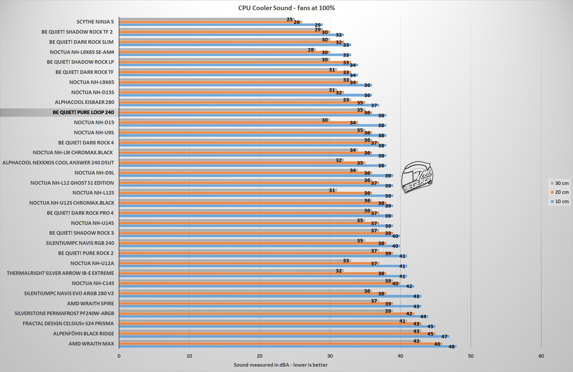 The overall cooling performance is very good, the Pure Loop 240 being at the top of the temperature charts alongside high end CPU coolers such as the Noctua NH-D15, Fractal Design Celsius+ S24 Prisma, or the SilverStone Permafrost PF240W-ARGB to name a few. However, the main advantage of the be quiet! Pure Loop 240 is that it manages to deliver this cooling performance while having a silent pump.