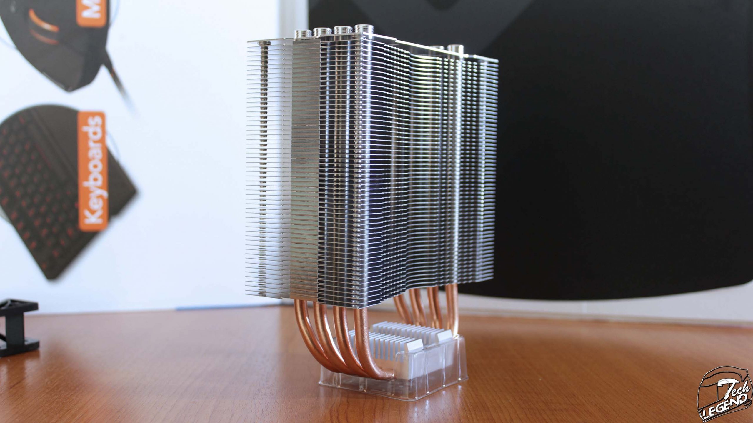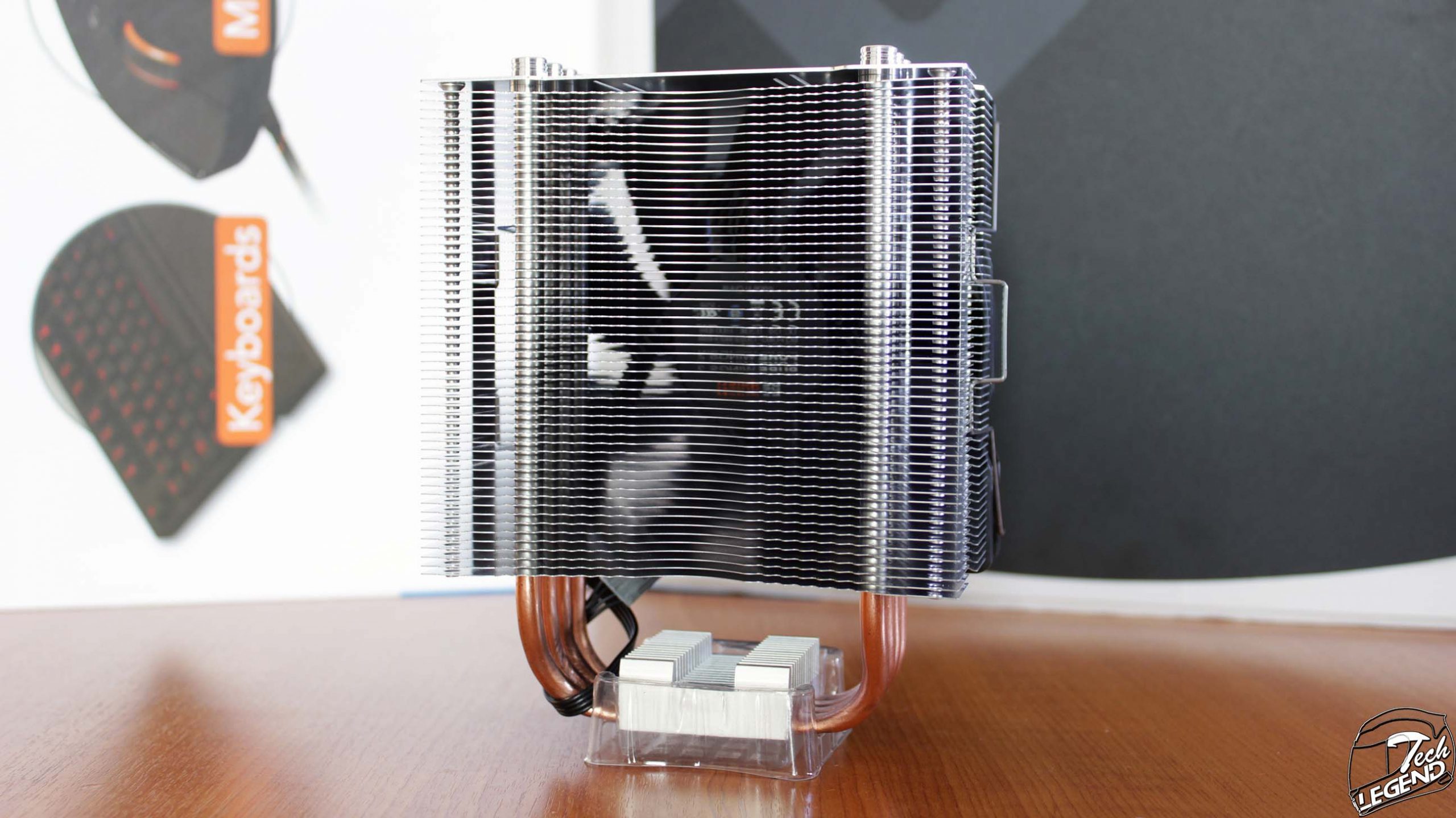 The heatsink has a single tower design and uses approximately 54 aluminum made cooling fins and four copper heatpipes. The surface of the top plate has as linear brushed texture, while the rest of the fins are smooth.