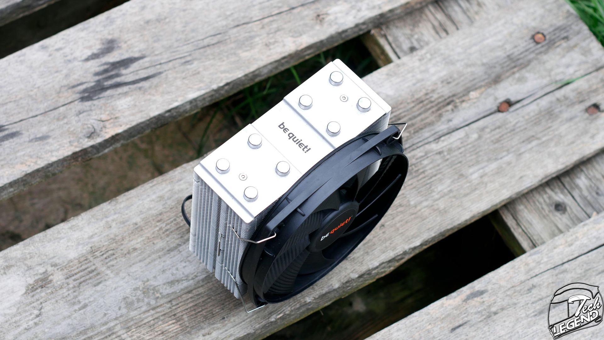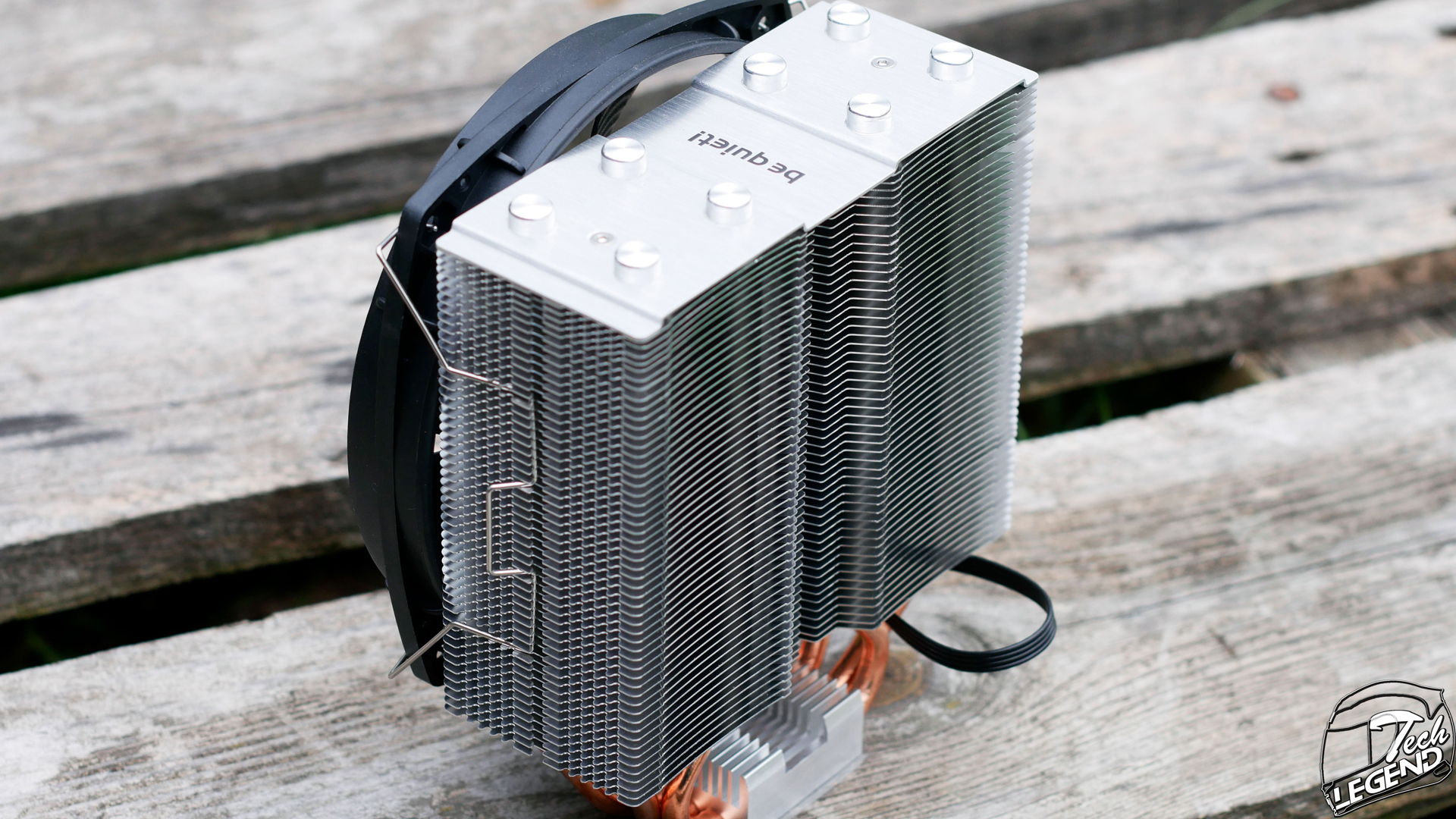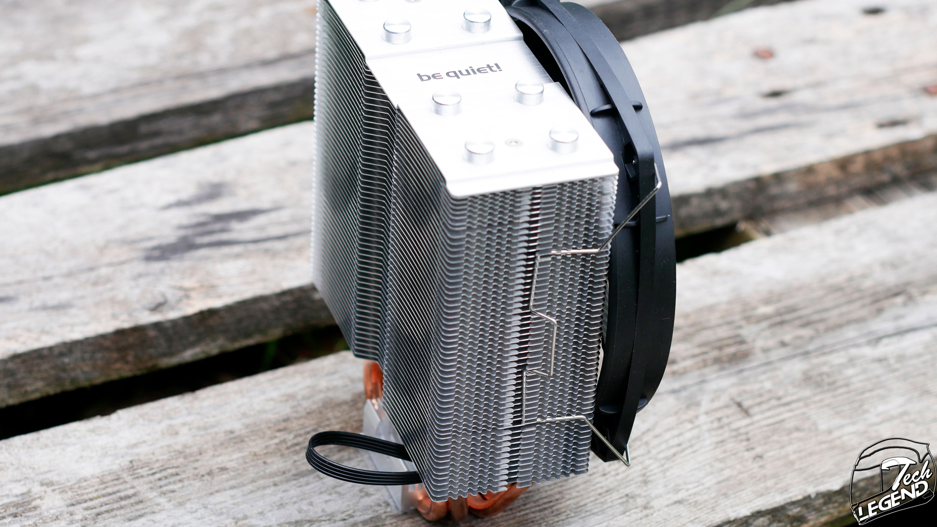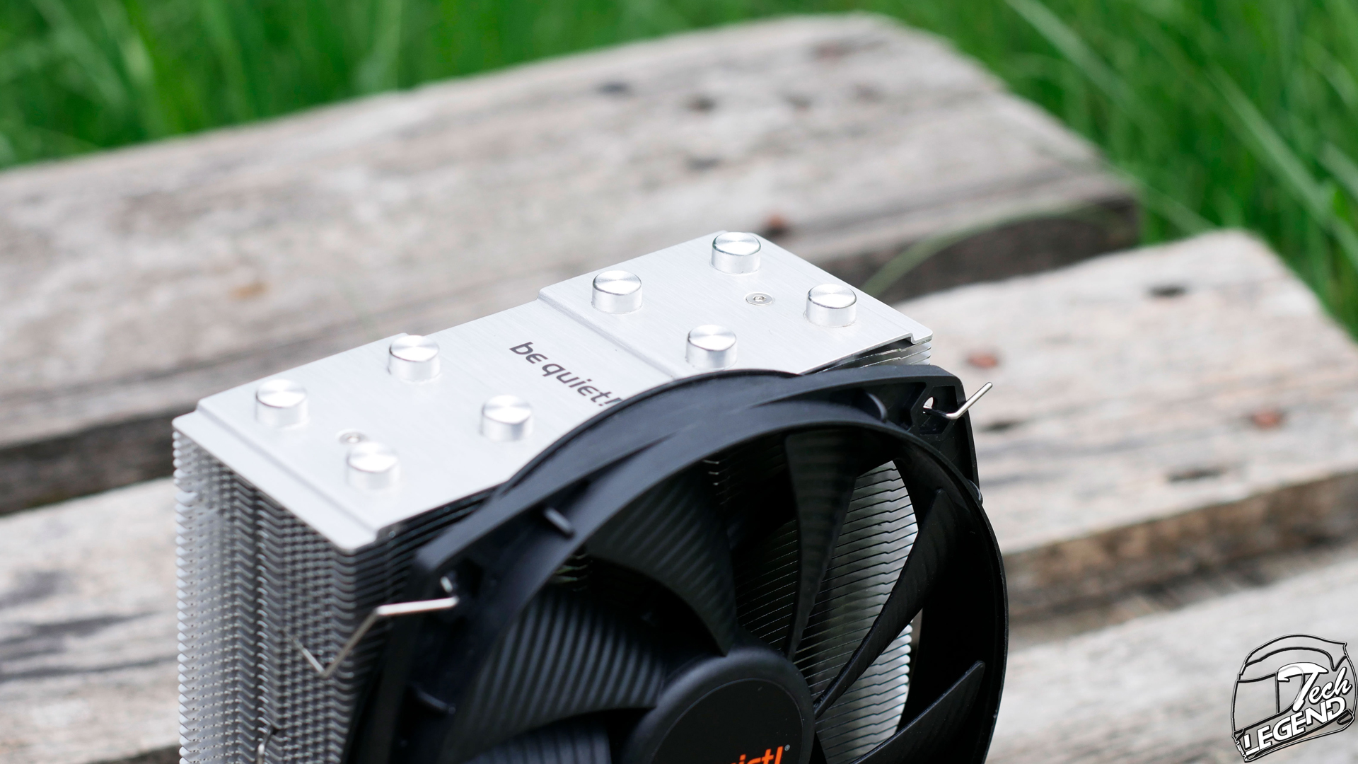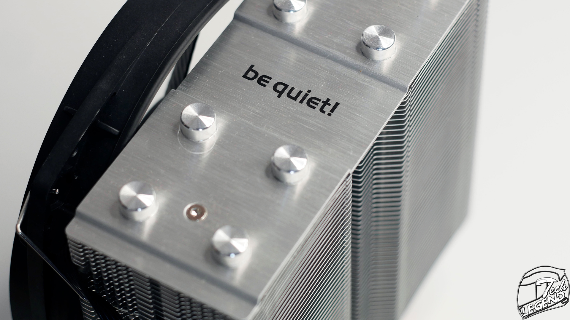 The top of the heatsink is covered by a thick aluminum plate that acts as a decoration. This top plate has a linear brushed texture and the be quiet! logo engraved into its surface. In addition, the heatpipe endings are covered by aluminum caps.
