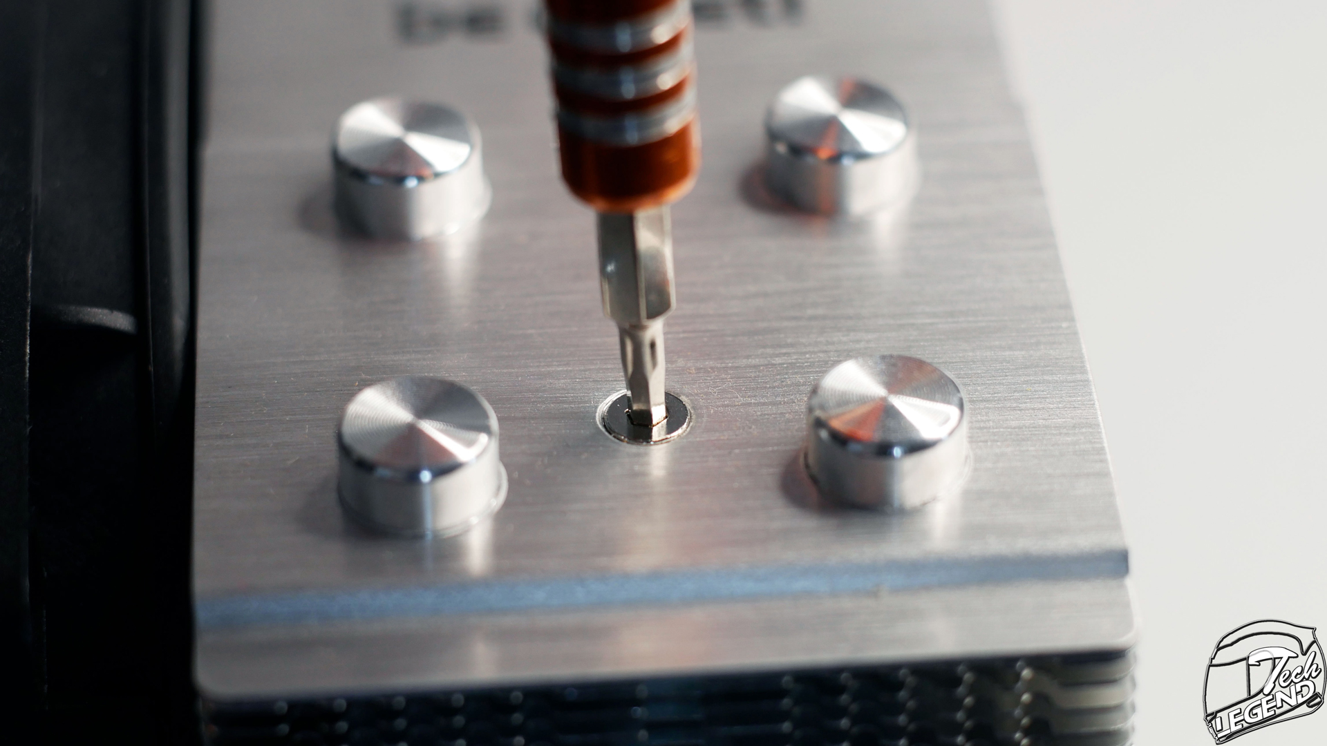 The decorative top plate has a brushed texture and can be removed if necessary. This plate is attached to the heatsink with only two hex screws. With those removed, the entire plate can be lifted up from the heatsink revealing the heatpipe endings.