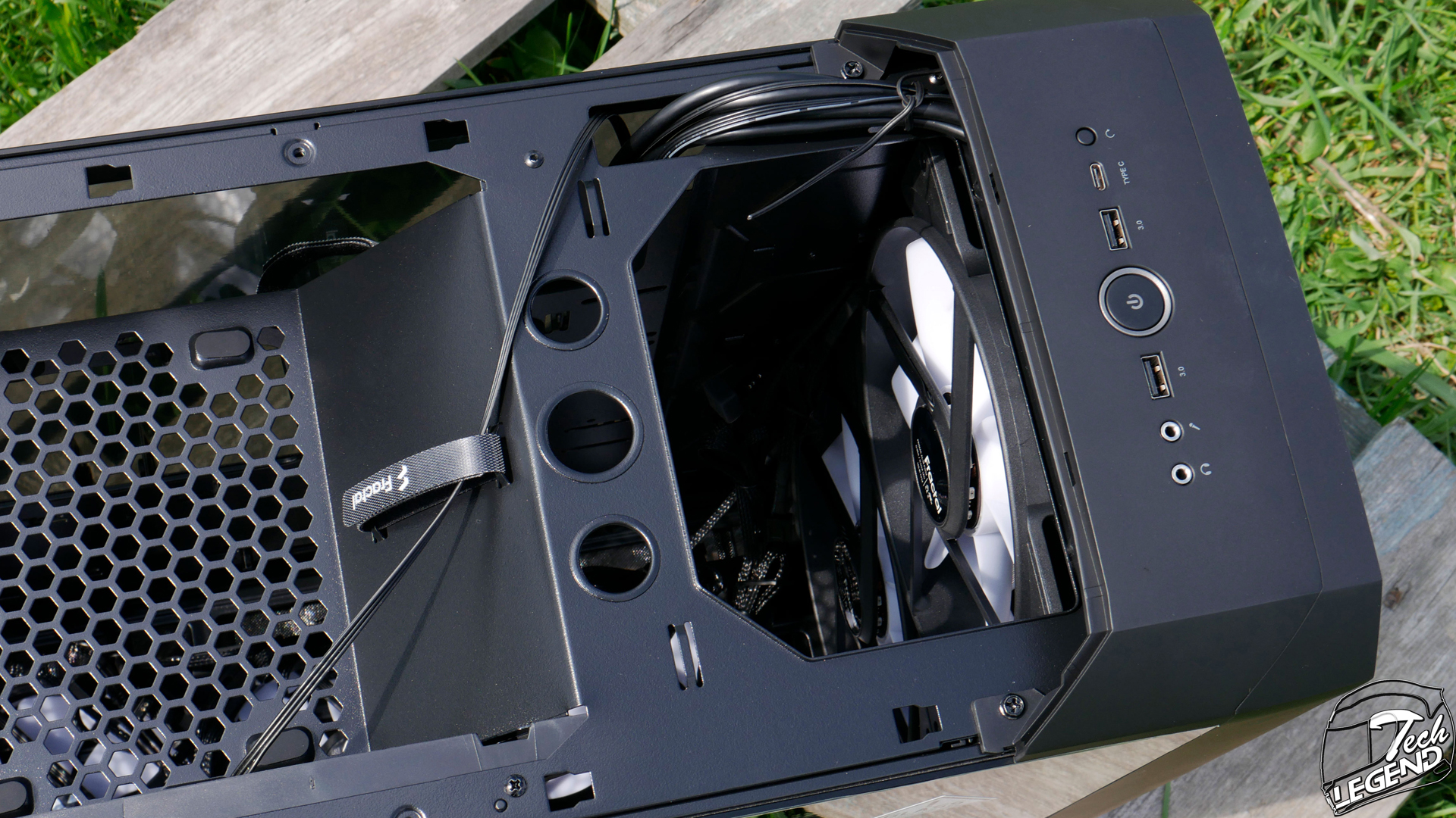 The I/O panel is installed on the top side of the case and its on a static panel. This means that you can remove all panels of the case without disturbing the I/O or its cables. The I/O panel includes the following: