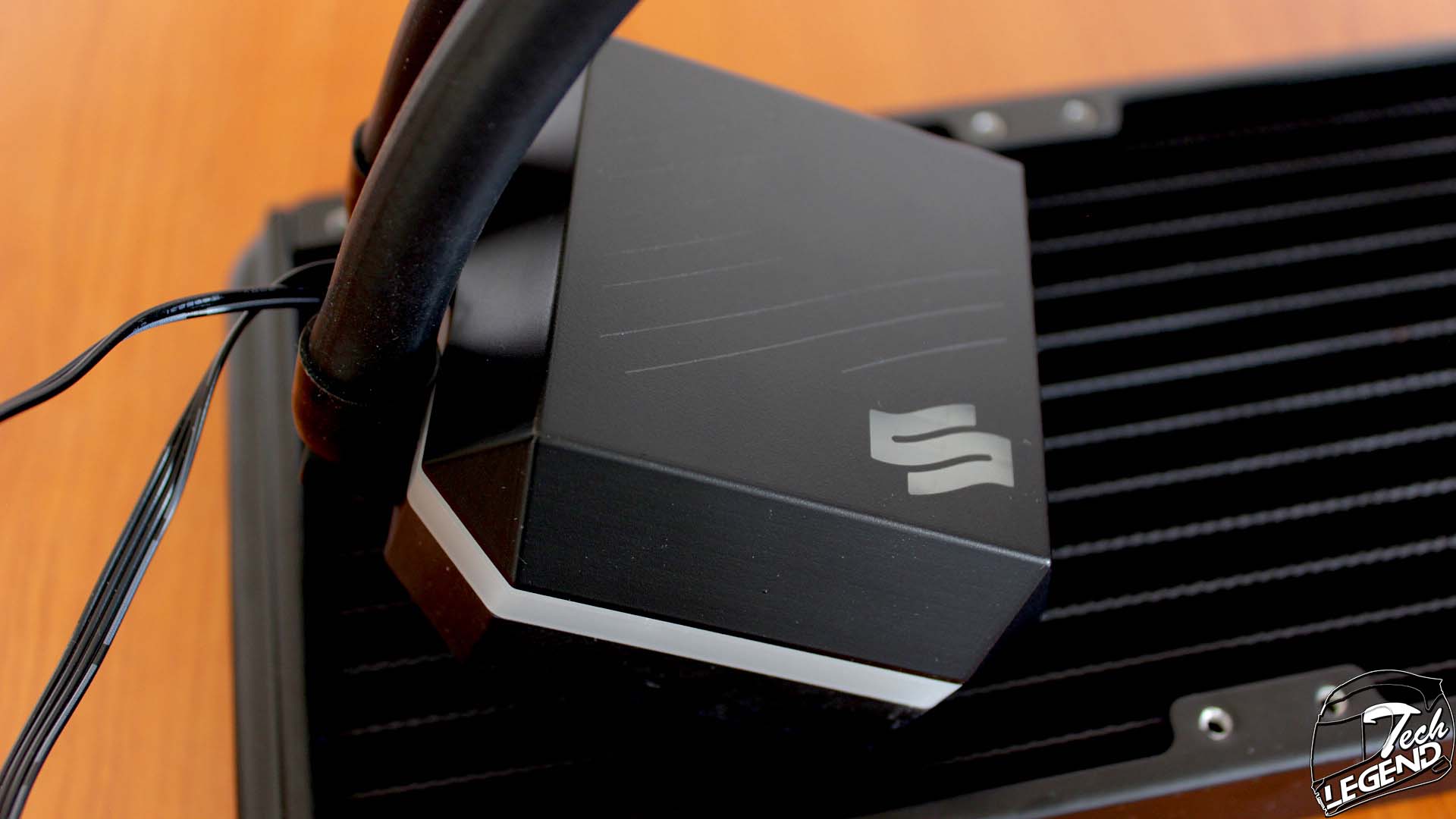 The CPU Block and pump assembly is compact with a height of 45mm and a width of 75mm. The RGB illuminated elements are the top plastic plate which features a line pattern as well as the manufacturer’s logo. The white frame that surrounds the block is also illuminated with the same RGB system.