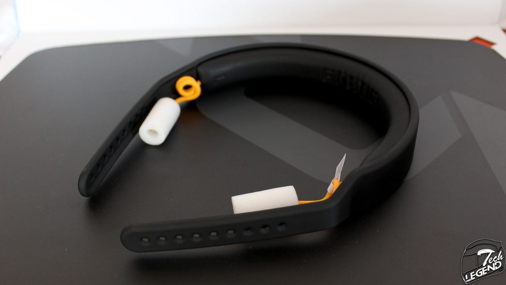 The headband is a made out of a single piece, this makes the connection between the speakers. The underside of the headband is covered in leather, here there is engraved the Fnatic name, in addition the sides of the headbands are perforated in order to allow the mounting and height adjustment of the speakers.