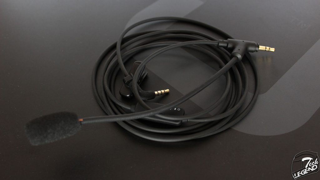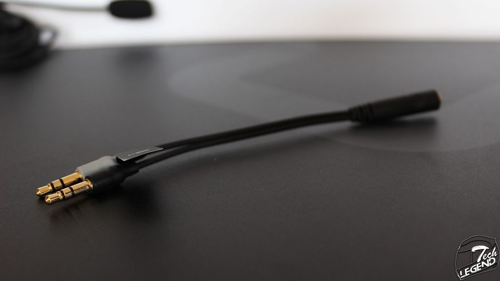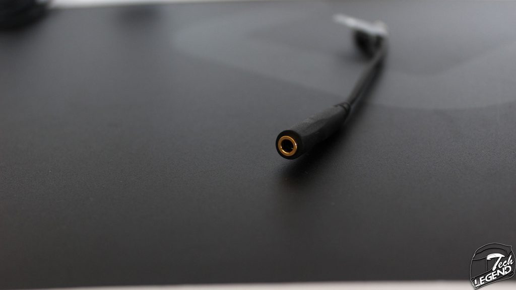 The main microphone is mounted on the headset’s cable, it is a boom type microphone and uses a sponge on top for sound filtering. It has a flexible structure and can be muted by using the in-line button. In the package, we find a jack splitter.