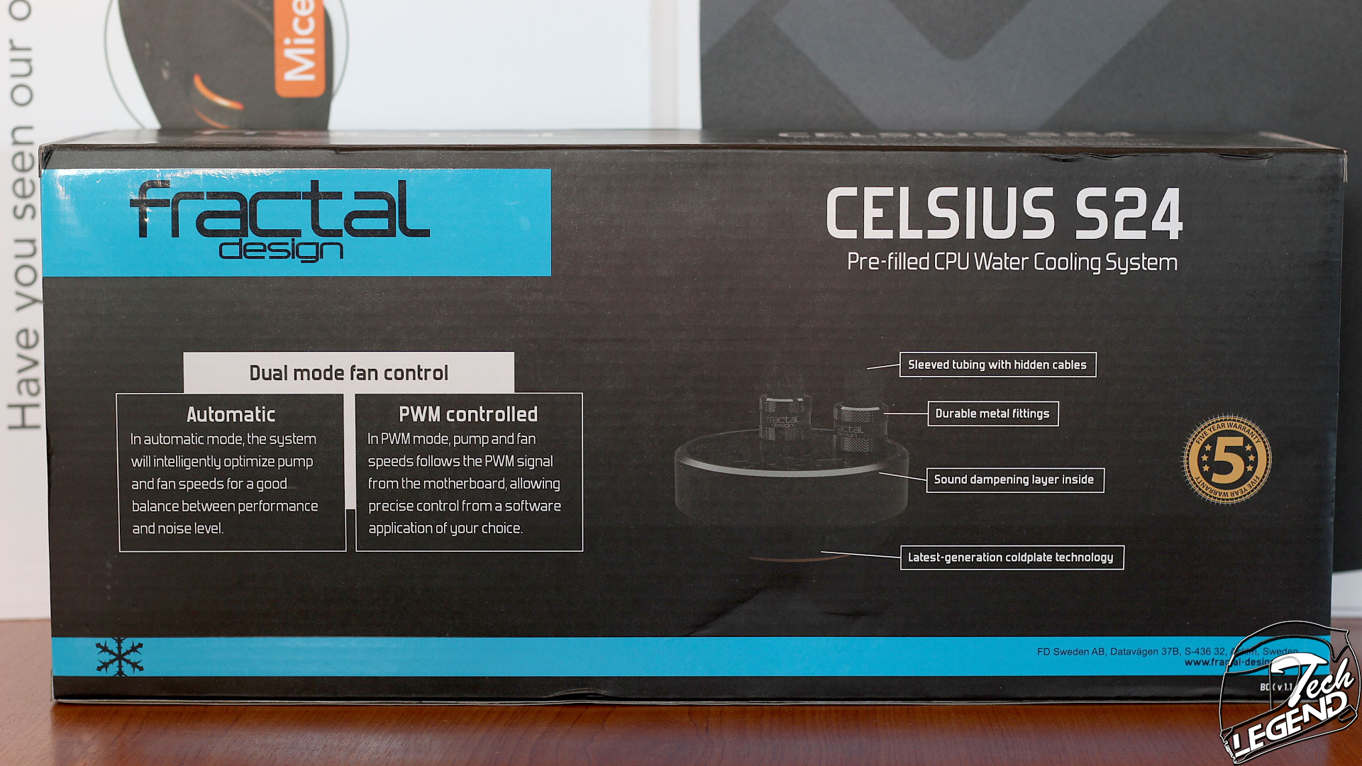 The Celsius S24 liquid cooler is packaged in a black and blue cardboard box that follows the design style of the packing used with the previous Fractal Design CPU Coolers.