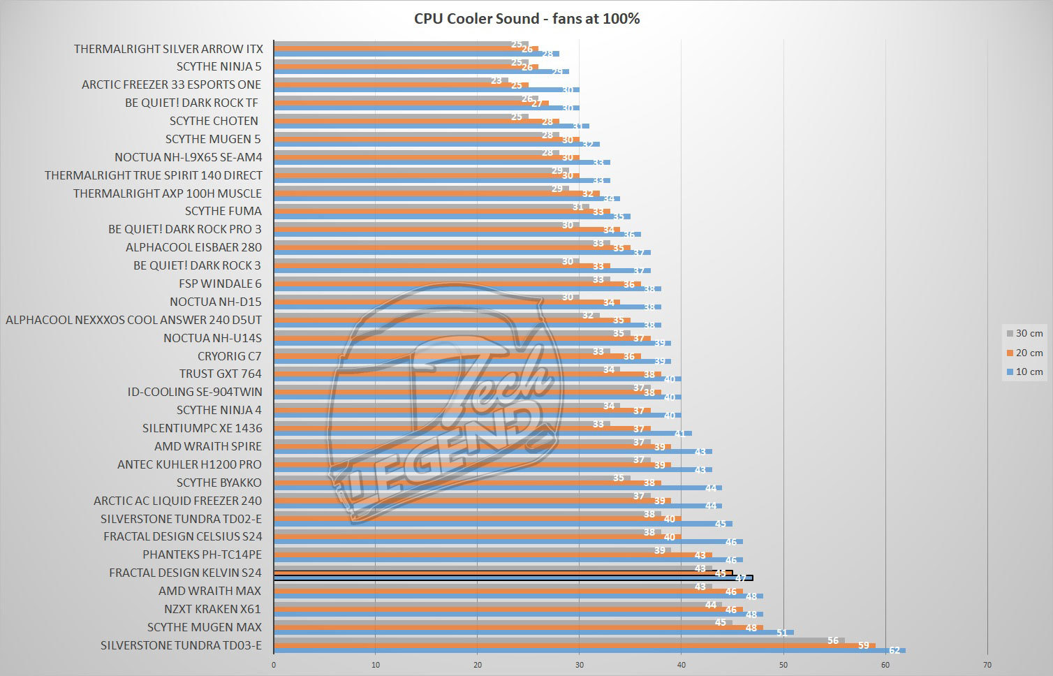 The noise level was measured at three different distances from the fans (10cm, 20cm, 30cm.) the noise was measured with a margin of error of ± 5 db.
