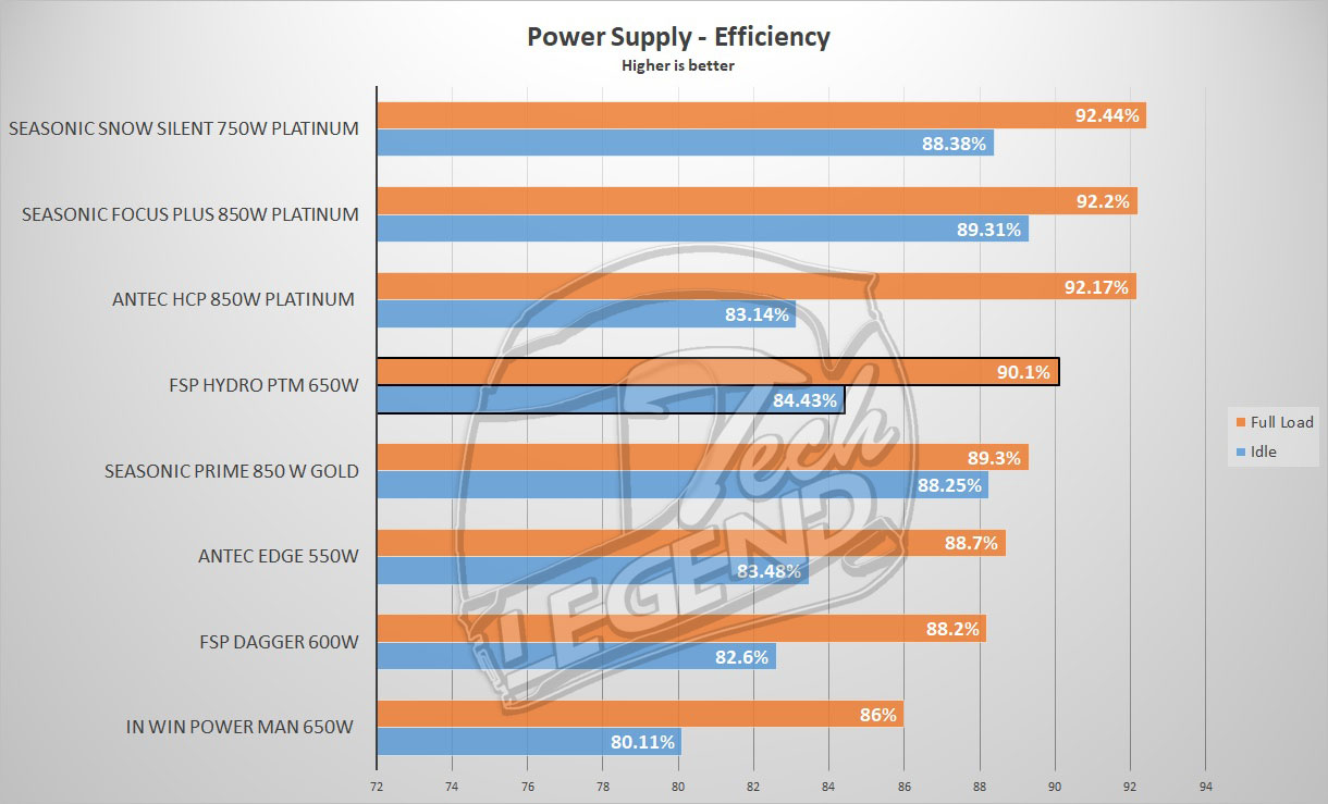 The performance of the Hydro PTM 650W is great, the efficiency of this unit when in load, reaches a value of 90.1% and 84.4% when at idle.