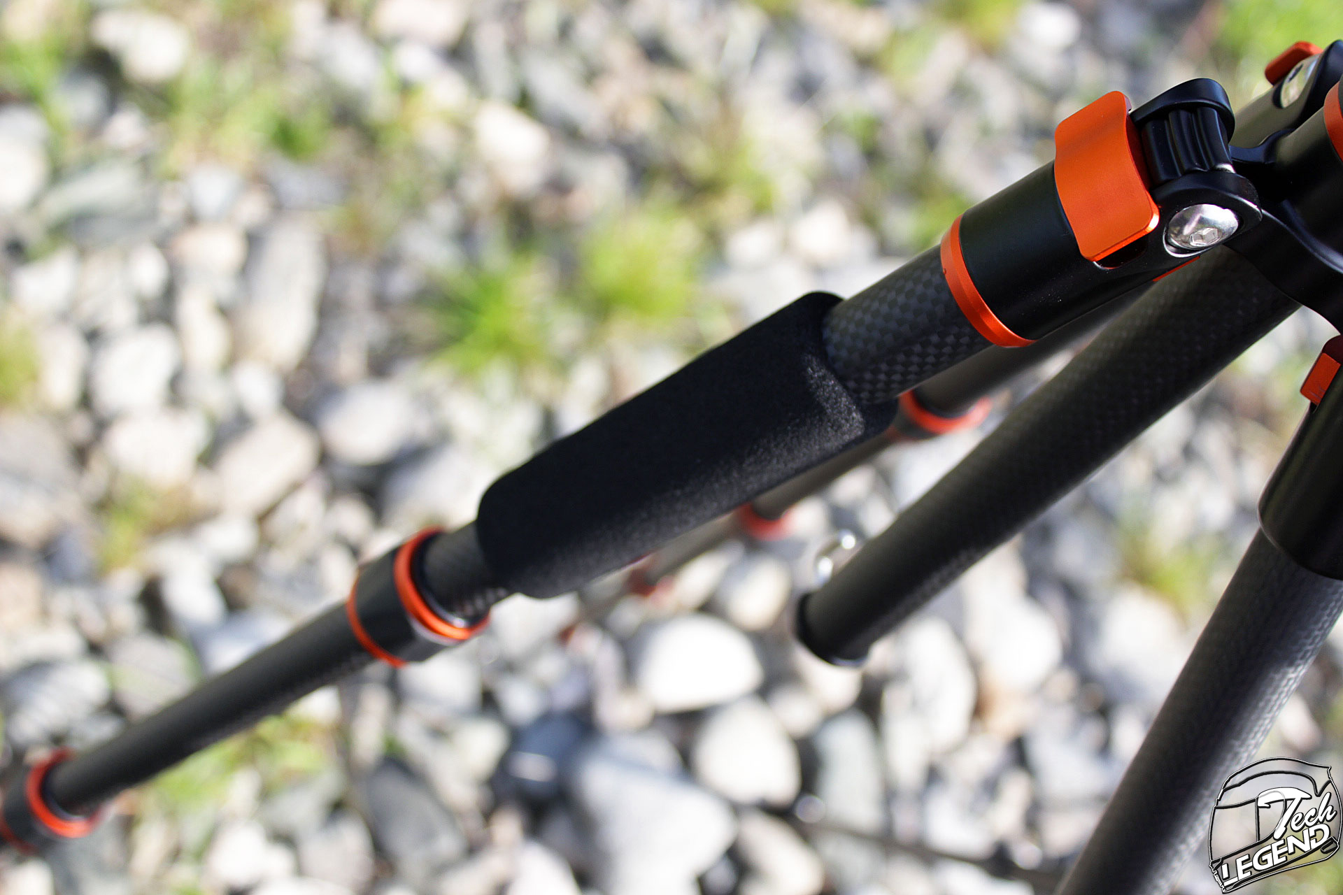 The main beam of the tripod, which is also the base for the tripod head, is divided into two segments. Each segment has its own twist lock mechanism. This is done to offer more adjustment options at the top of the tripod. However, this will also lower the overall rigidity of the tripod. The twist locks have a good design, with orange accents on the sides, and a thick rubber pad in the middle.