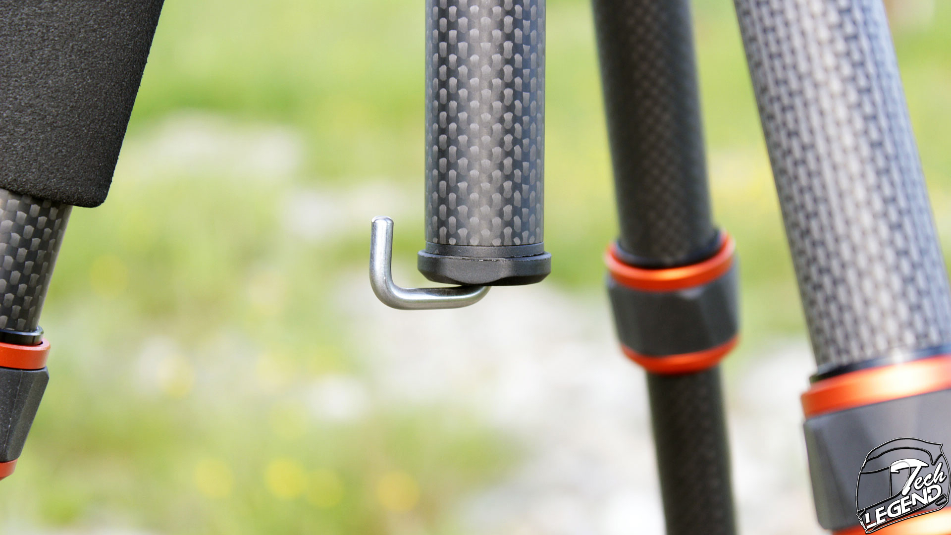At the bottom of the tripod body there is a spring-loaded hook. This hook can be used for two things: hold your back when not in use, or attach a weight to press on the tripod and increase its stability.