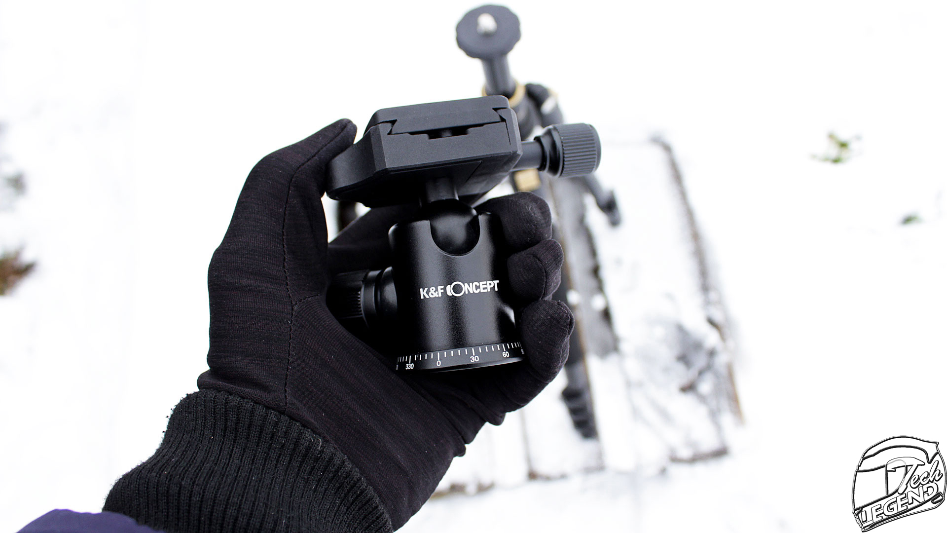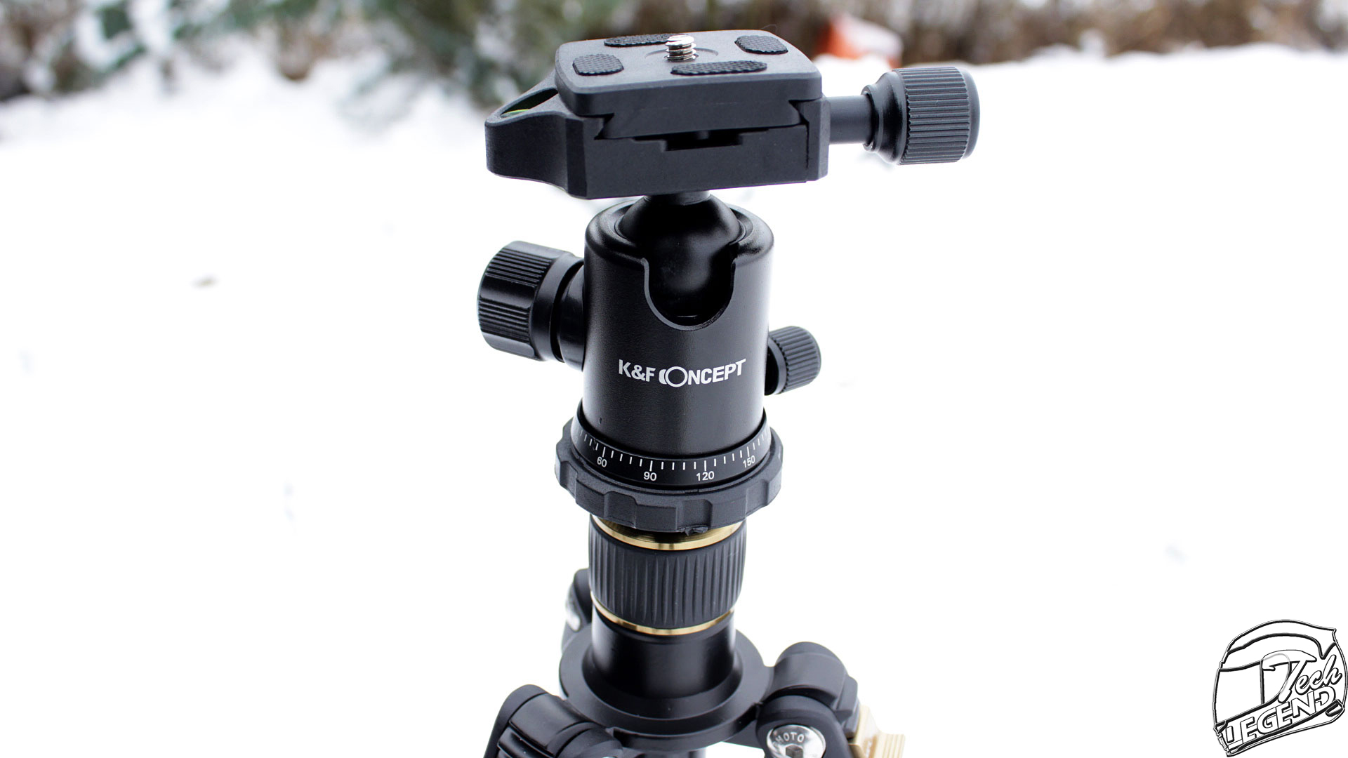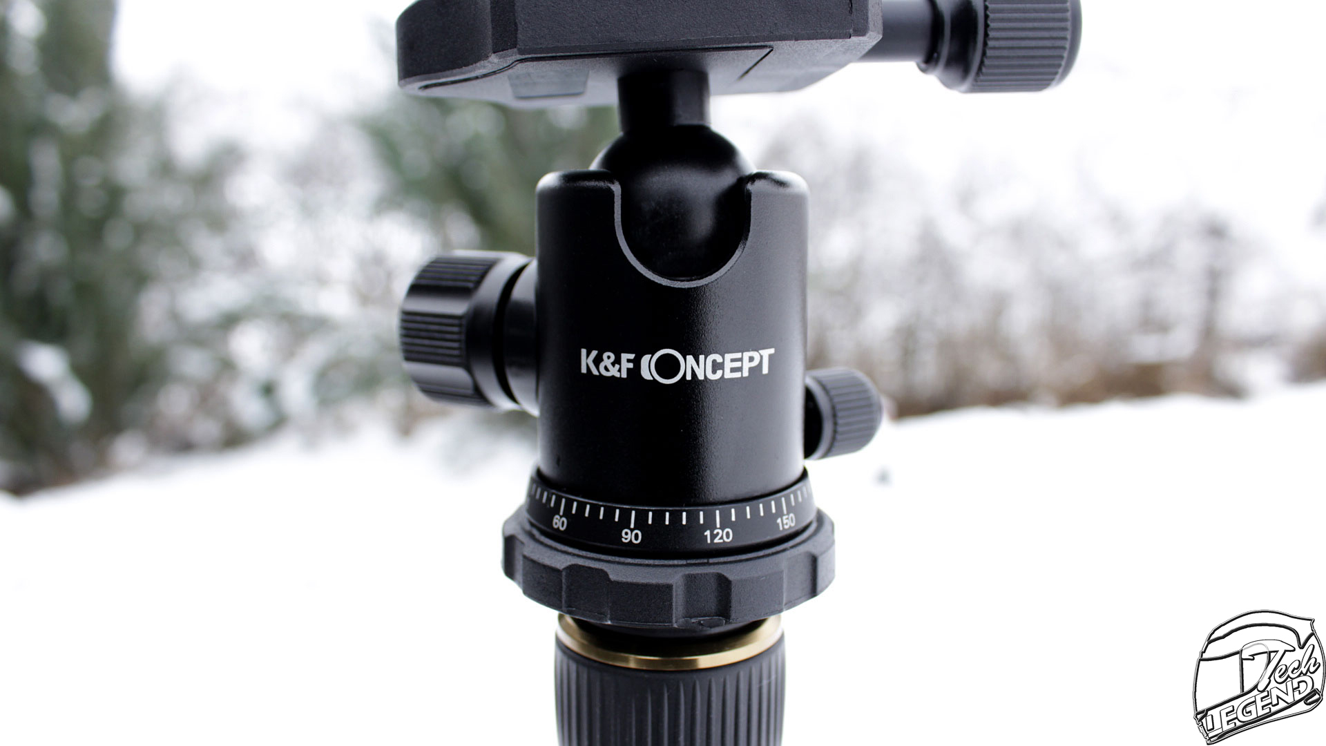 The tripod head preinstalled on the KF-TM2324 is a standard ball head. This type of tripod head allows for free adjustment on all axis. In addition, the bottom part of the head has white numerical markings to facilitate 360° panoramic photography. This ball head also has included a simple liquid bubble level.