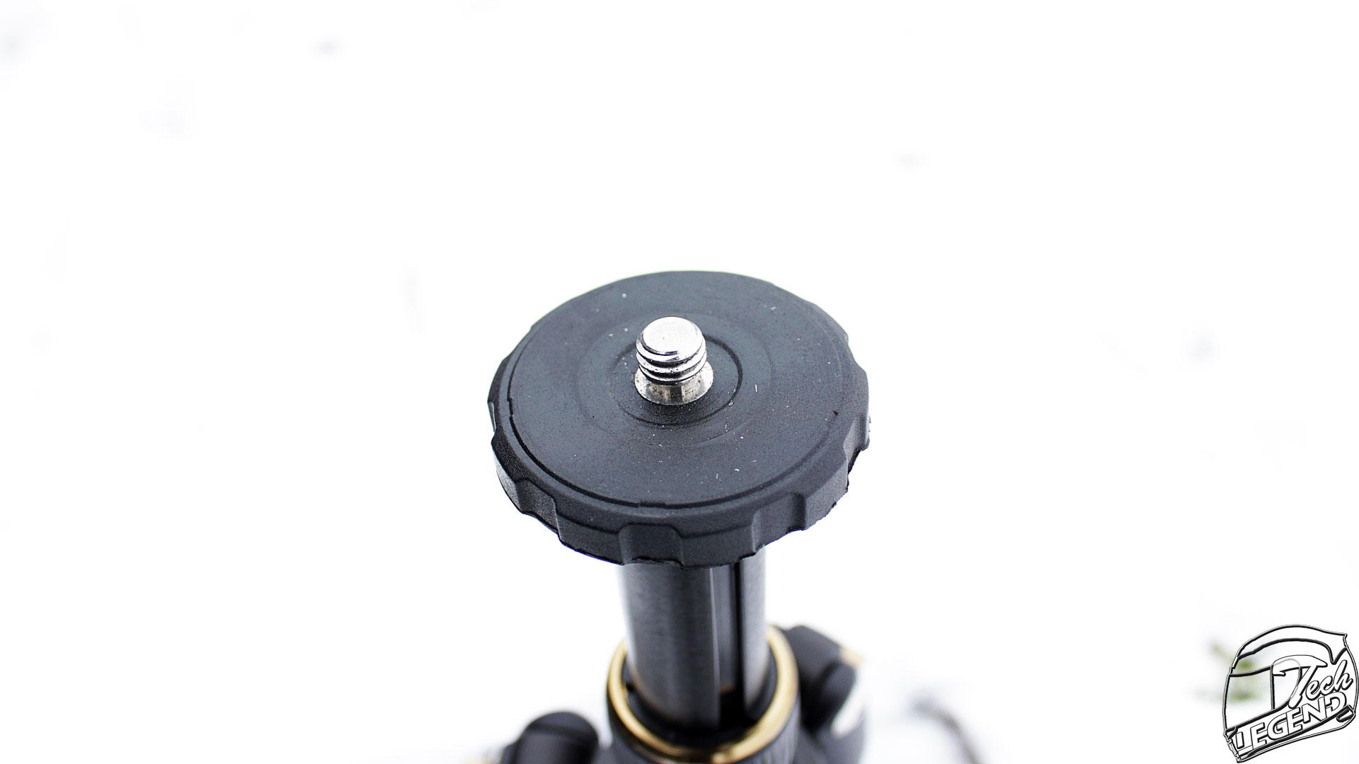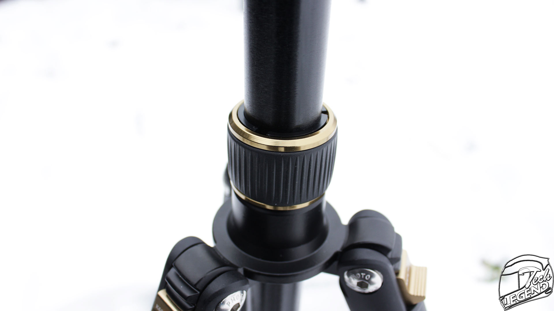 The main beam of the tripod, which also serves as the base where the tripod head mounts can move on a vertical axis. This beam is held in place by a single large nut that is attached to the upper part of the tripod body. This nut has gold accents on the upper and lower parts, while the middle is covered by a textured rubber surface.