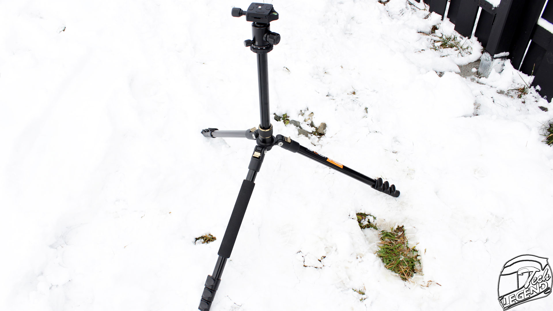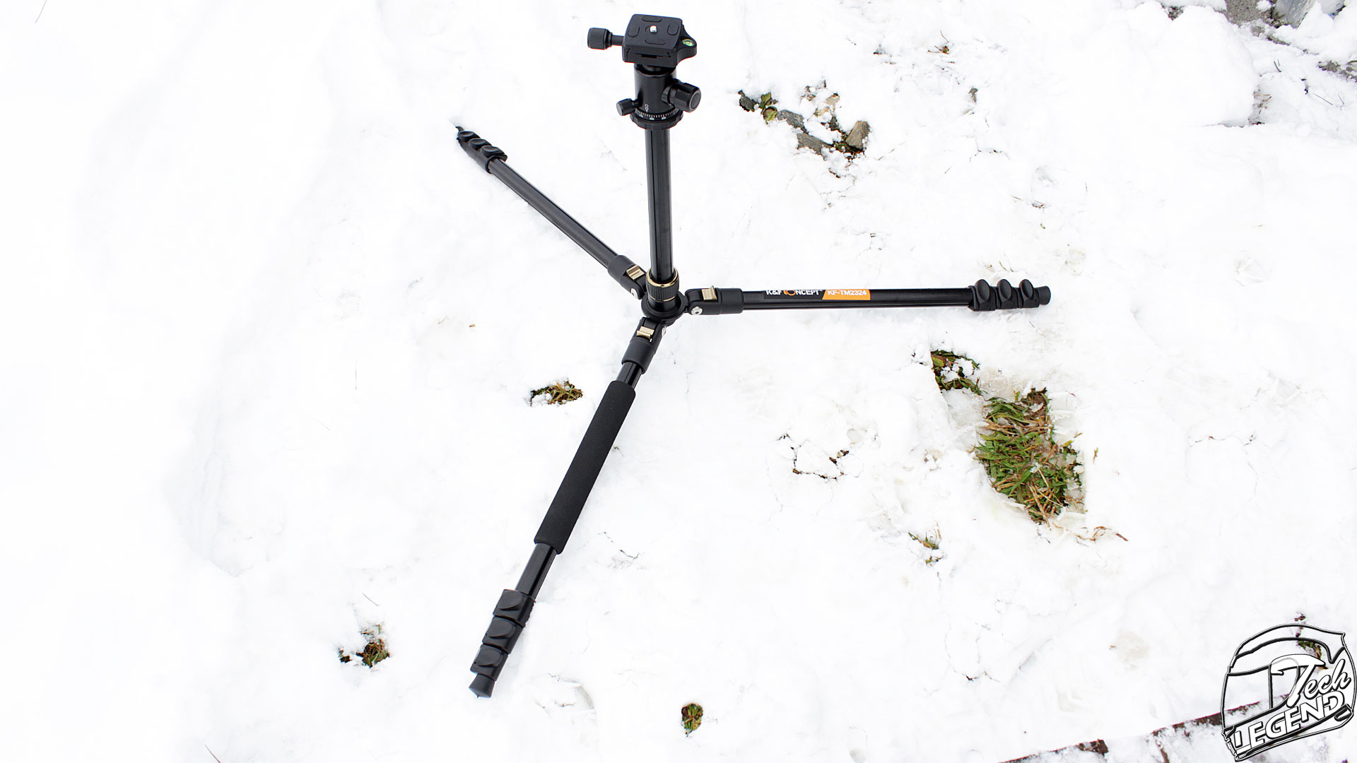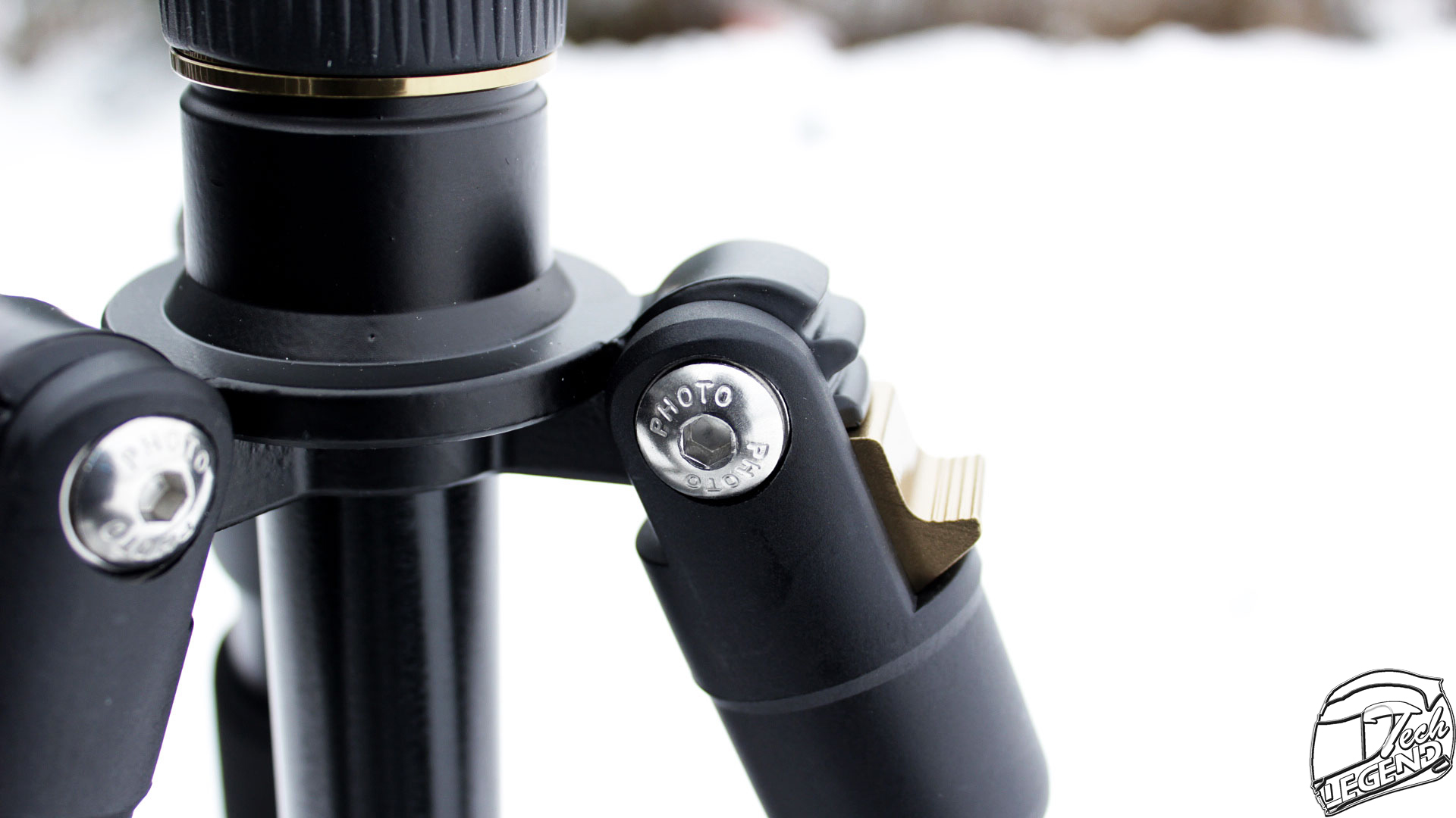 The legs of the tripod can be rotated upwards and allow the usage of an inverted layout. The system used to stop the rotation of the legs is a simple spring-loaded button which needs to be pressed to allow for the rotation of the legs.