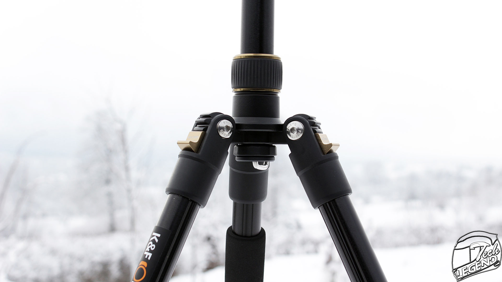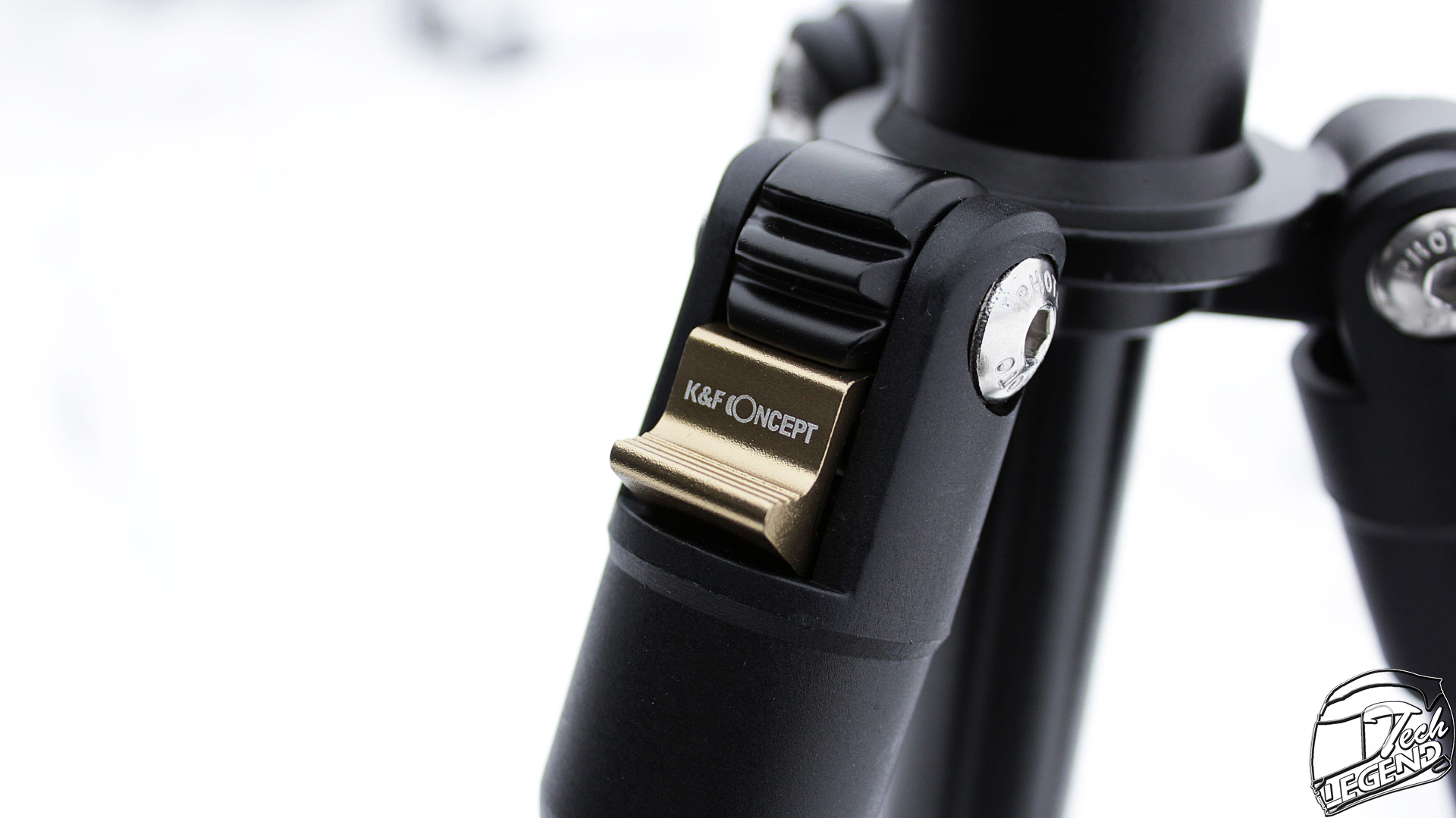 The KF-TM2324 is a lightweight travel tripod that has a maximum load capacity of 10kg and a maximum height of 1565mm. The design of the tripod is simple, with gold accents on important components, and a matte black finish on the body.