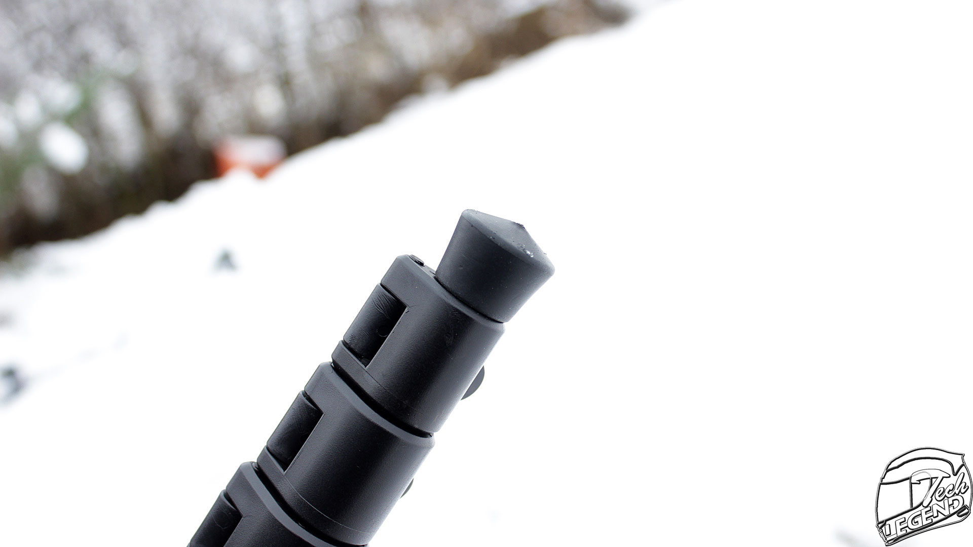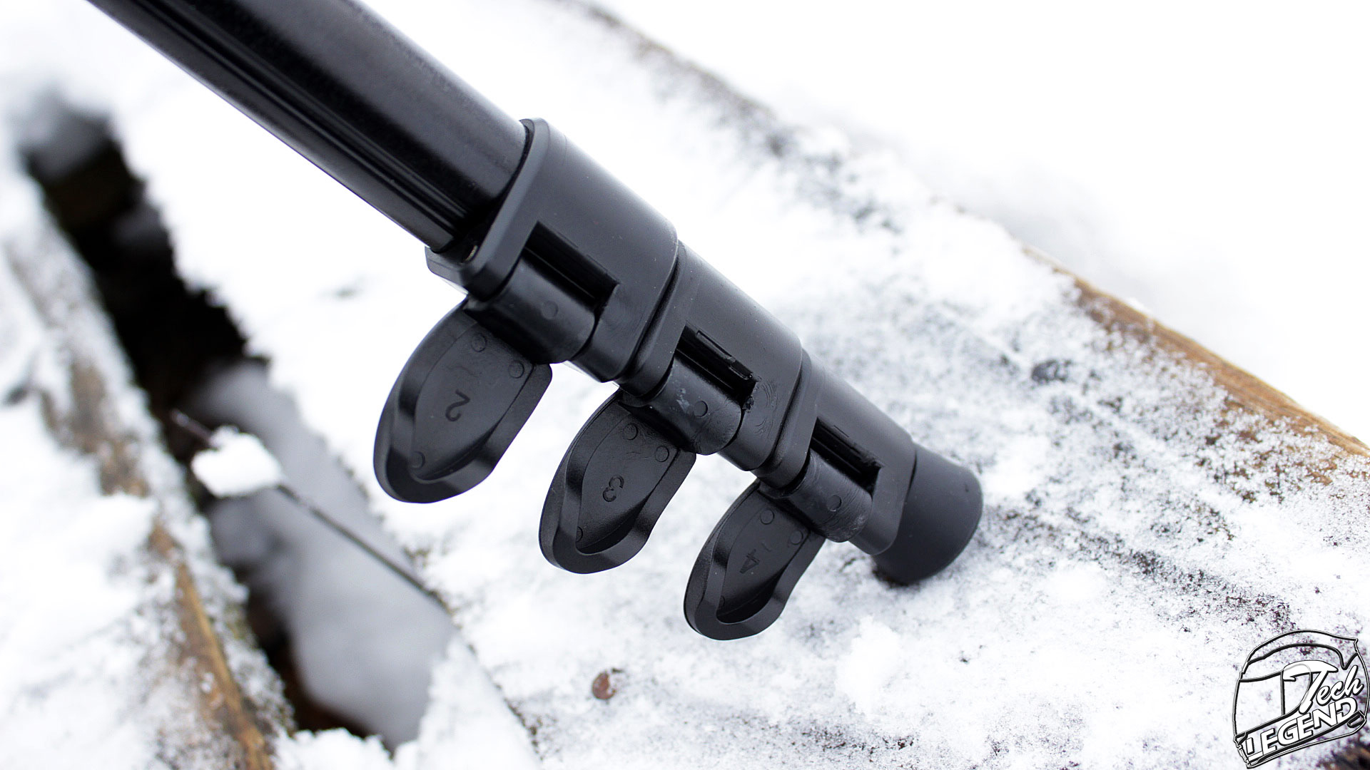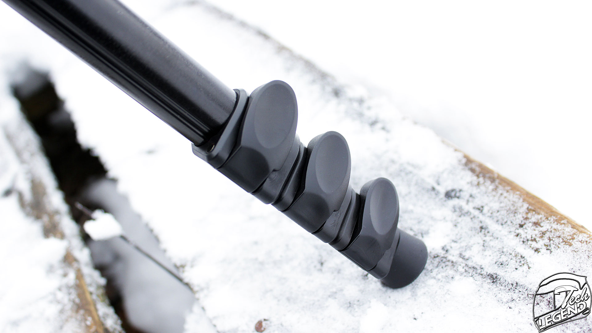 The legs are telescopic and retract inside the casing of the bigger leg on the upper side. The legs are stopped from rolling out by plastic quick release clips. A quick thing to one is that only a single leg has a foam pad installed.