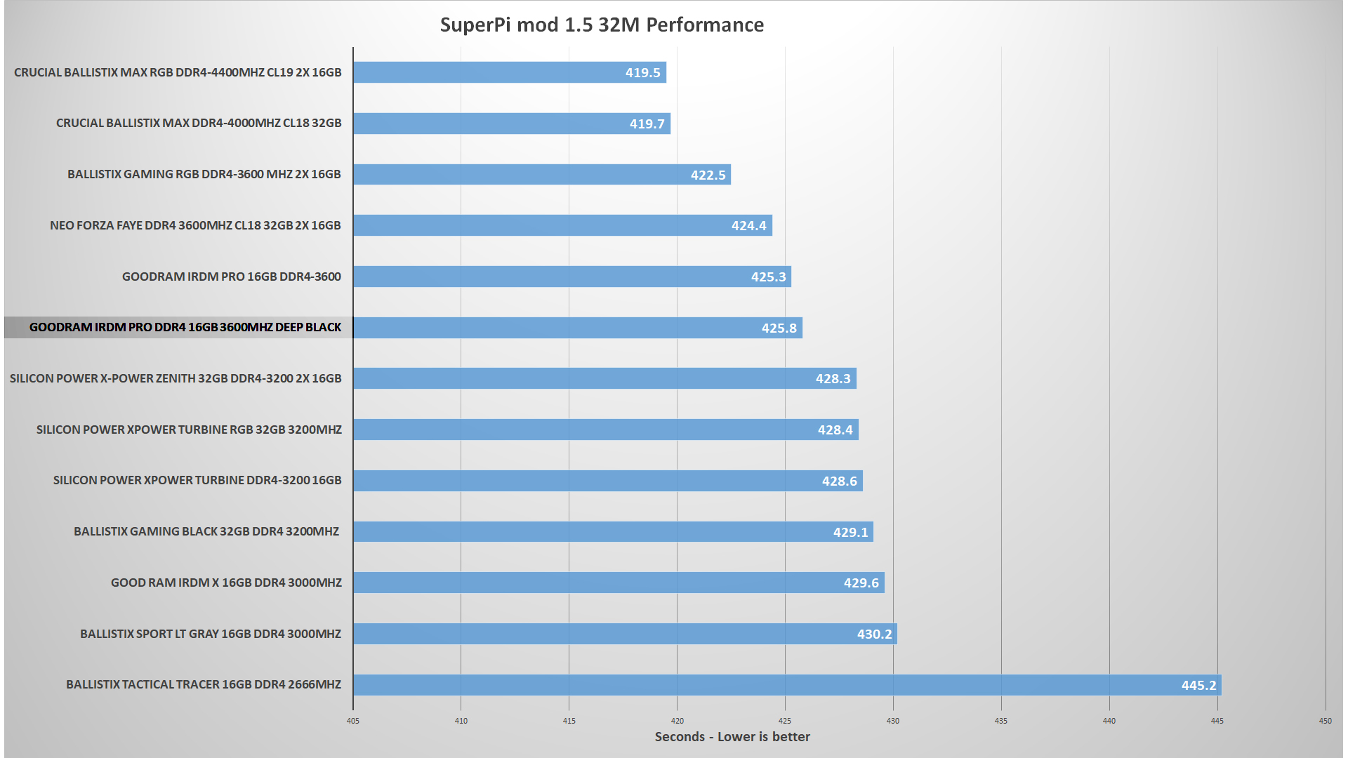 The RAM was tested using the CPU at its turbo frequency of 5GHz. The memory was first tested using the standard X.M.P frequency while the second test was done with the memory at the maximum frequency reached while Overclocking. Each test was done a minimum of three times. Keeping the original timings and only increasing the voltage to 1.45v, the GOODRAM IRDM PRO DDR4 DEEP BLACK reached a maximum frequency of 3866MHz.