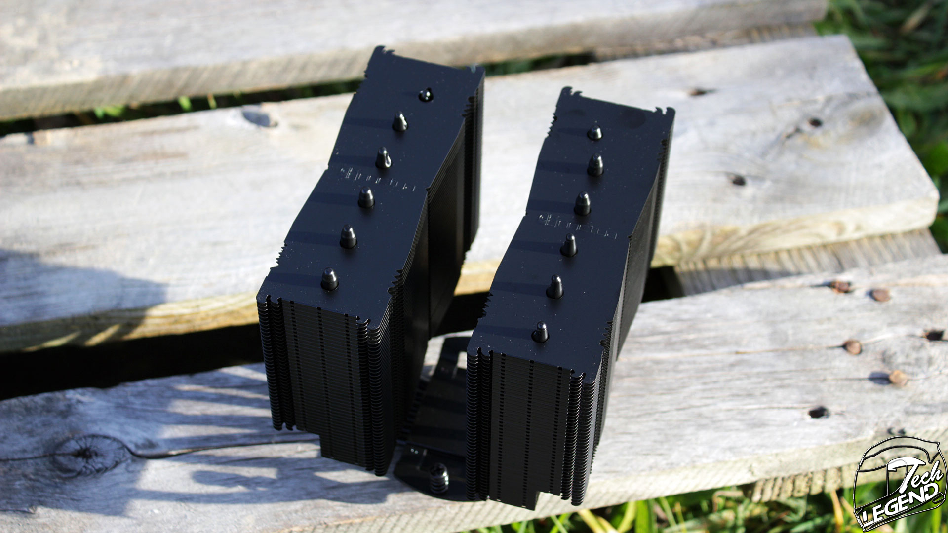 The cooler uses a total of 45 aluminum cooling fins on each of the two towers. These make direct contact with the heatpipes and the base of the cooler. The sides of the fins are shaped downwards creating a stacked structure. This not only improves the look of the cooler but also increases the rigidity of the heatsink.
