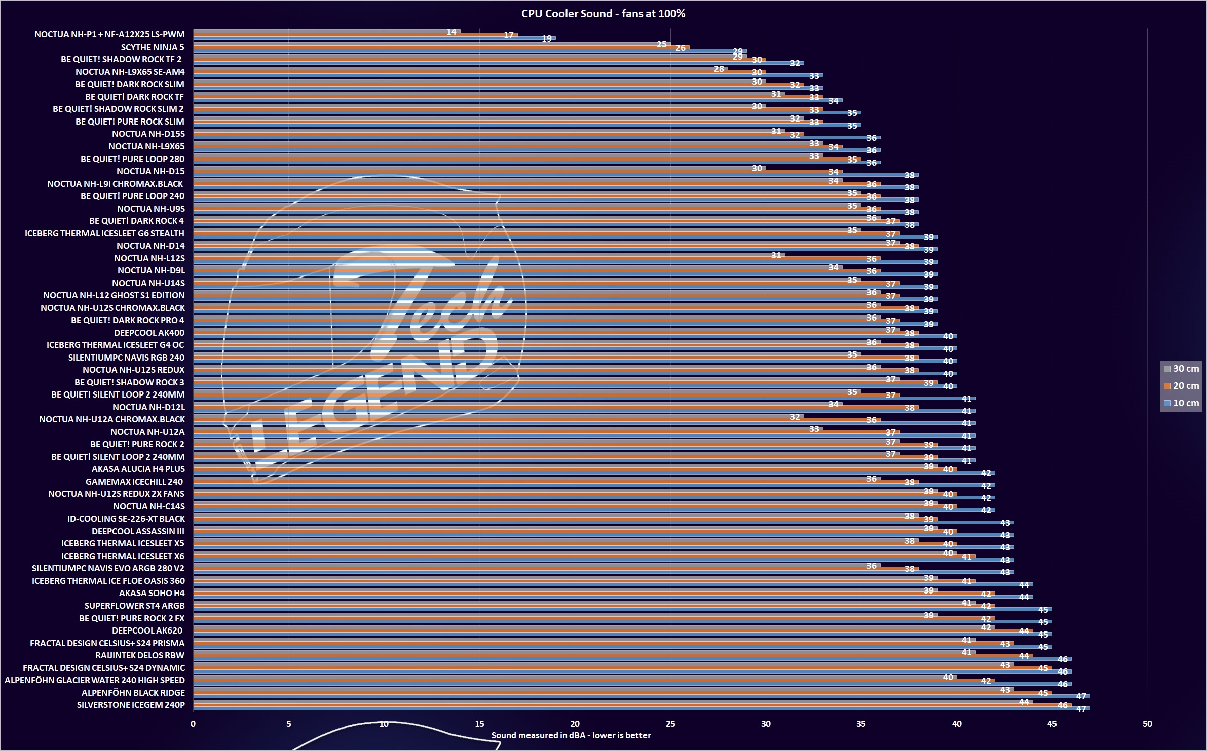 The noise level was measured at three different distances from the fans (10cm, 20cm, 30cm.) the noise was measured with a margin of error of ± 2 db.
