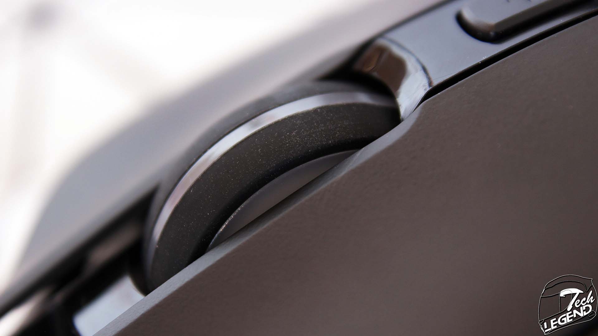The scroll wheel has a dual texture construction; the top and upper sides are covered by a rubber coating to increase the grip. The while portions are made from plastic that has a matte white texture, this is done to not only to allow for the light from the LEDs to shine through, but to provide an even spread of the colors.