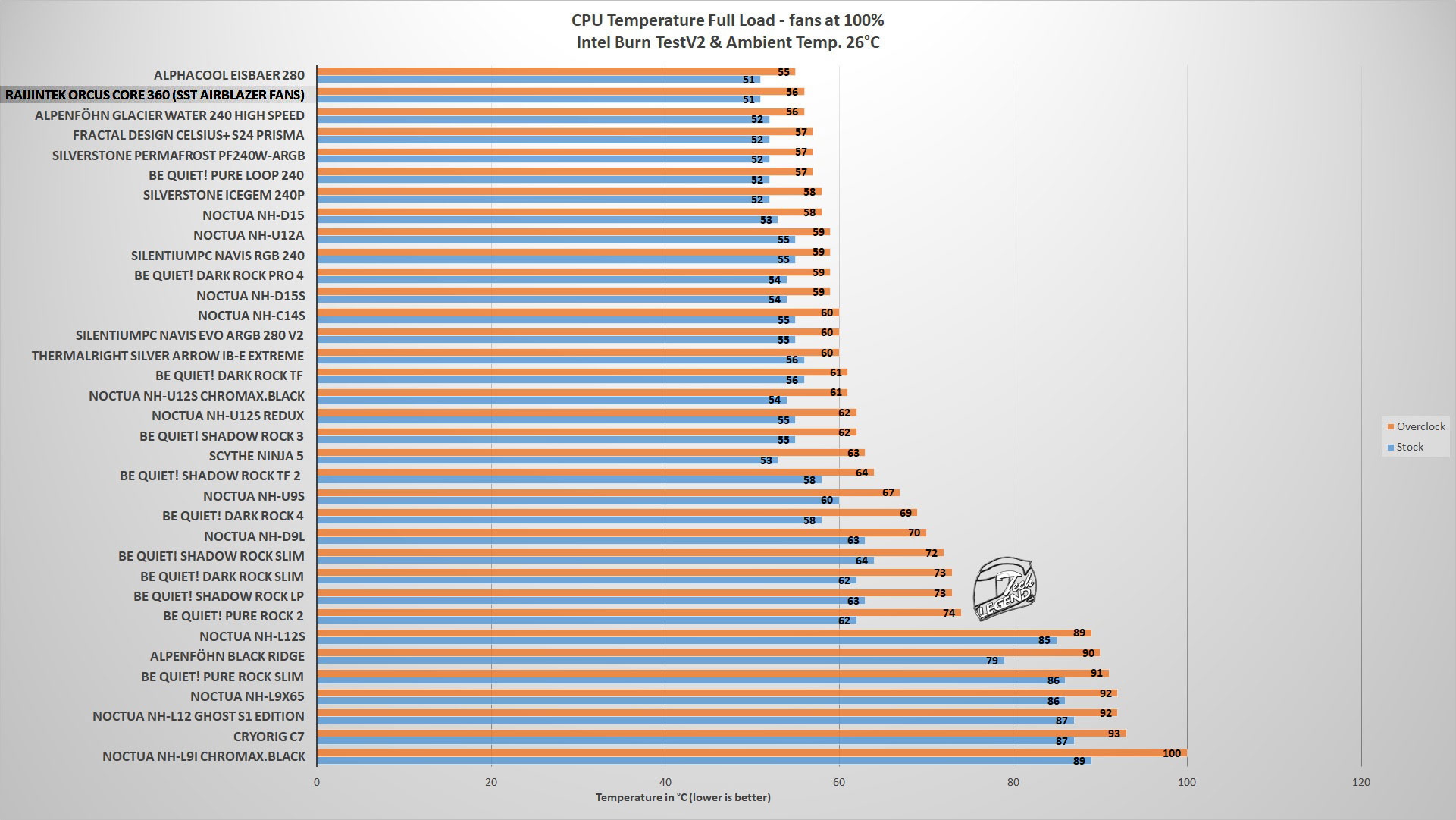 The cooler was tested with the CPU at the default turbo frequency of 4.9 GHz and overclocked to 5 GHz with a core voltage of 1.261 V.