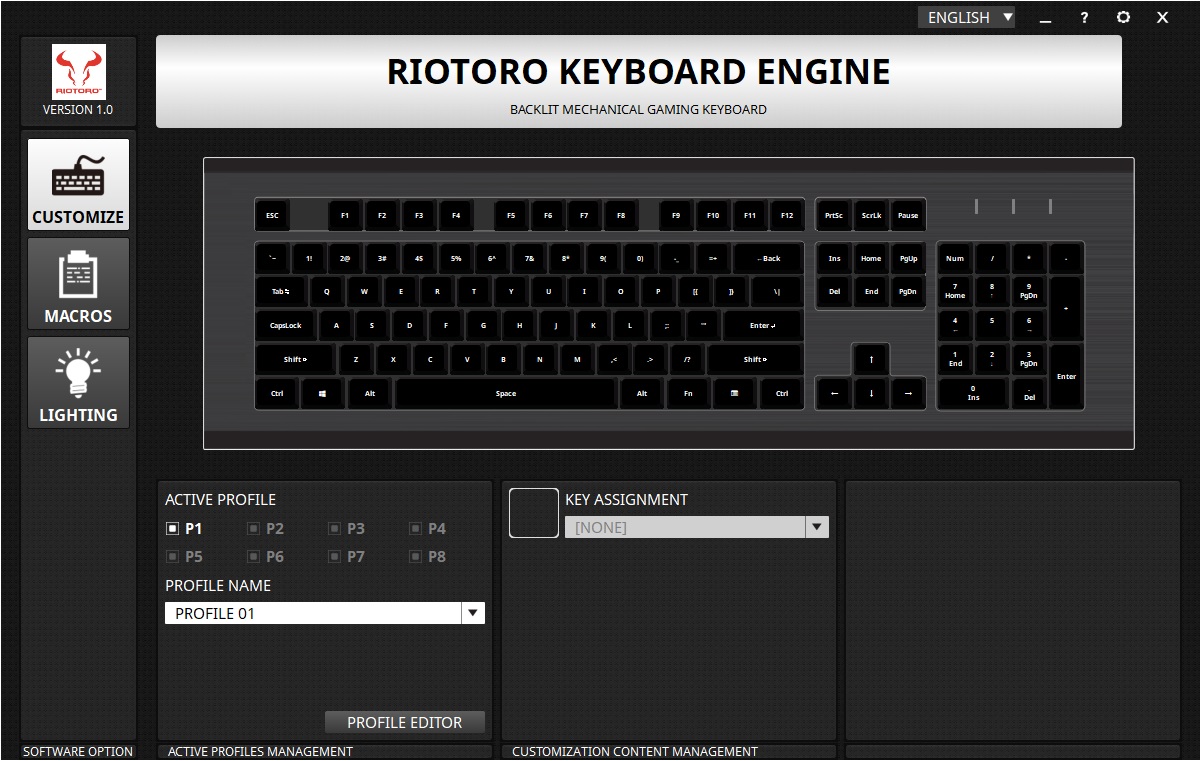 The first page of the software deals with the rebinding of all keys on the keyboard and saving, editing and selecting the custom profiles you set up.