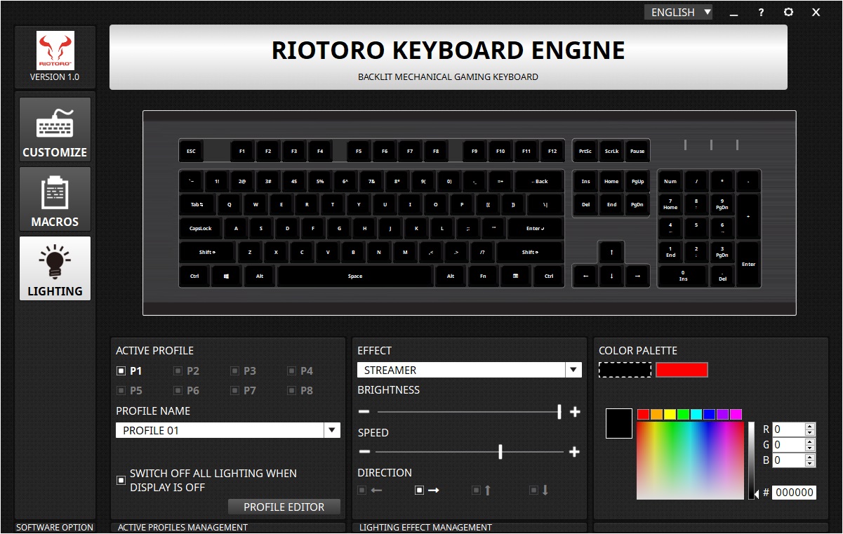 The third and last page on this software is the RGB slash LED management for the keyboard. Here you can select the pattern for the RGB LED and their color, or create your own custom pattern from scratch.