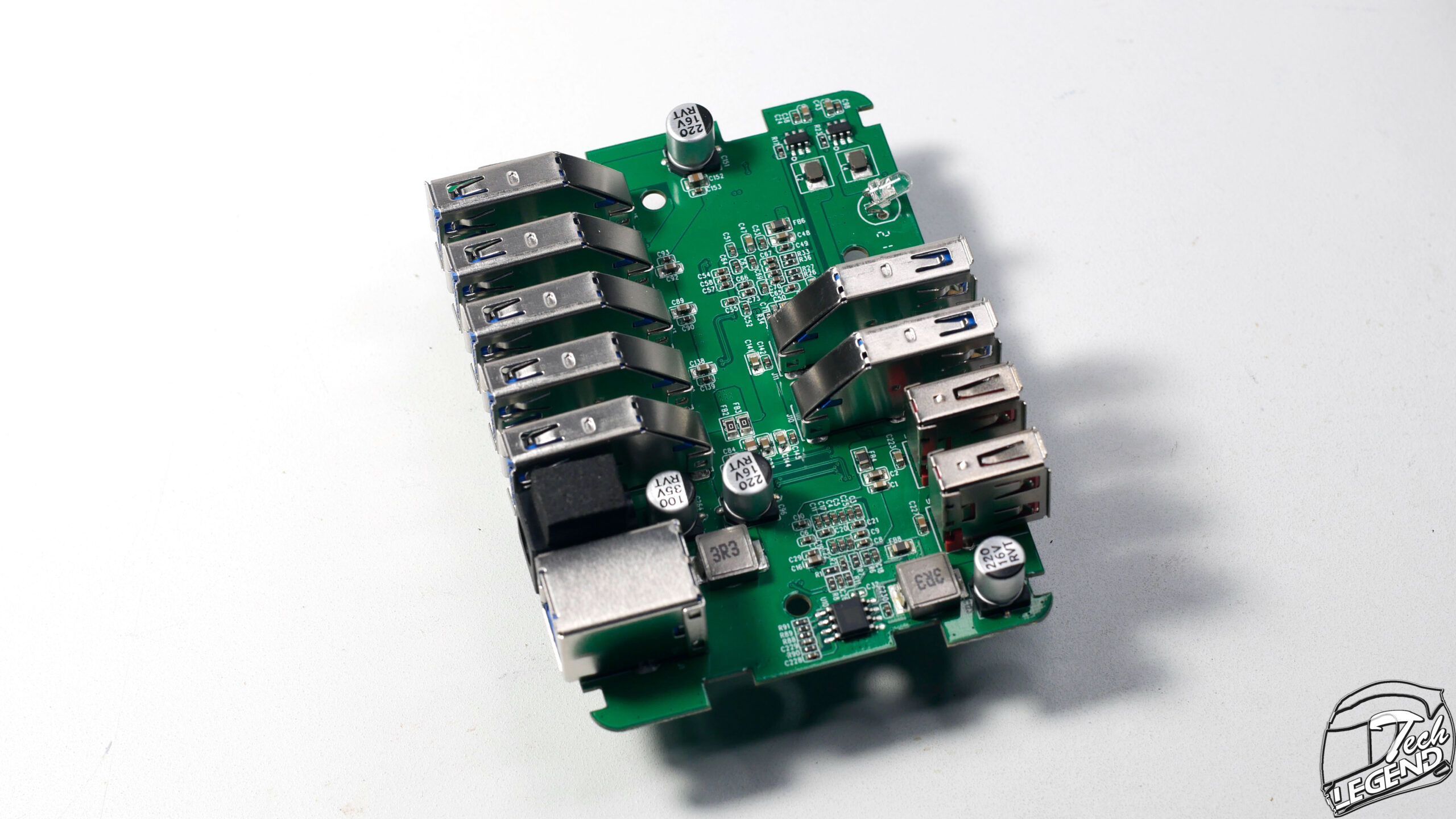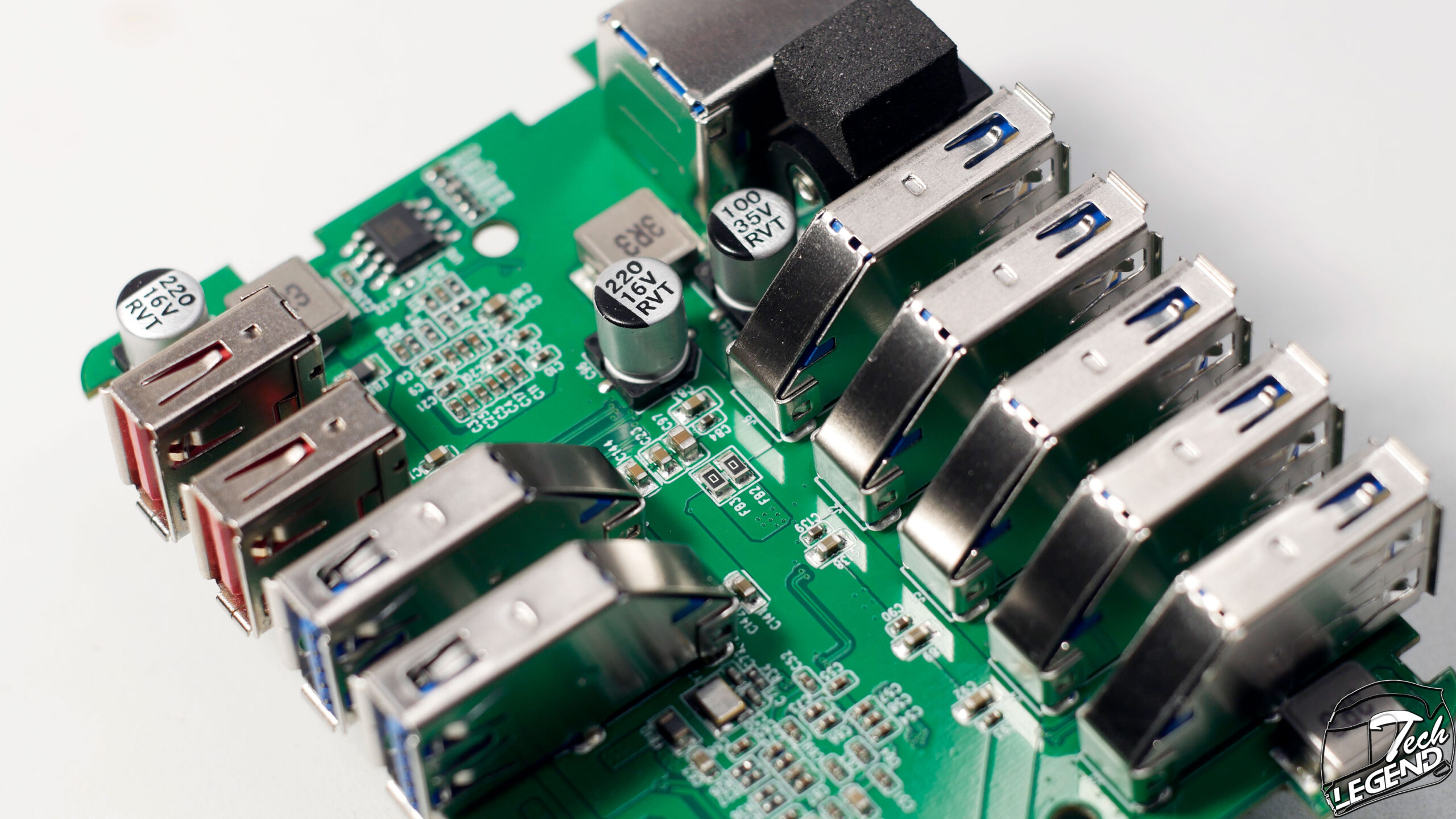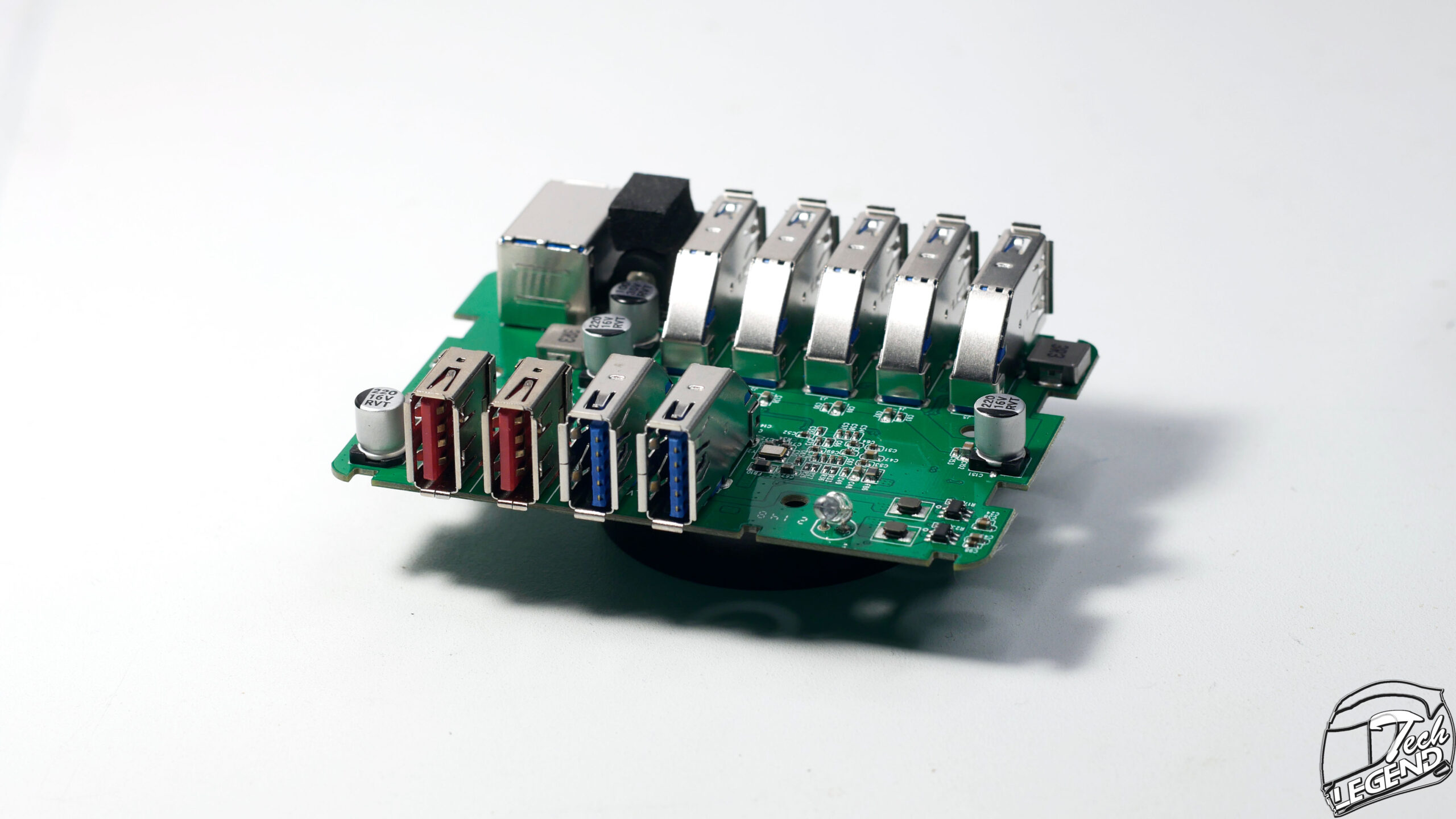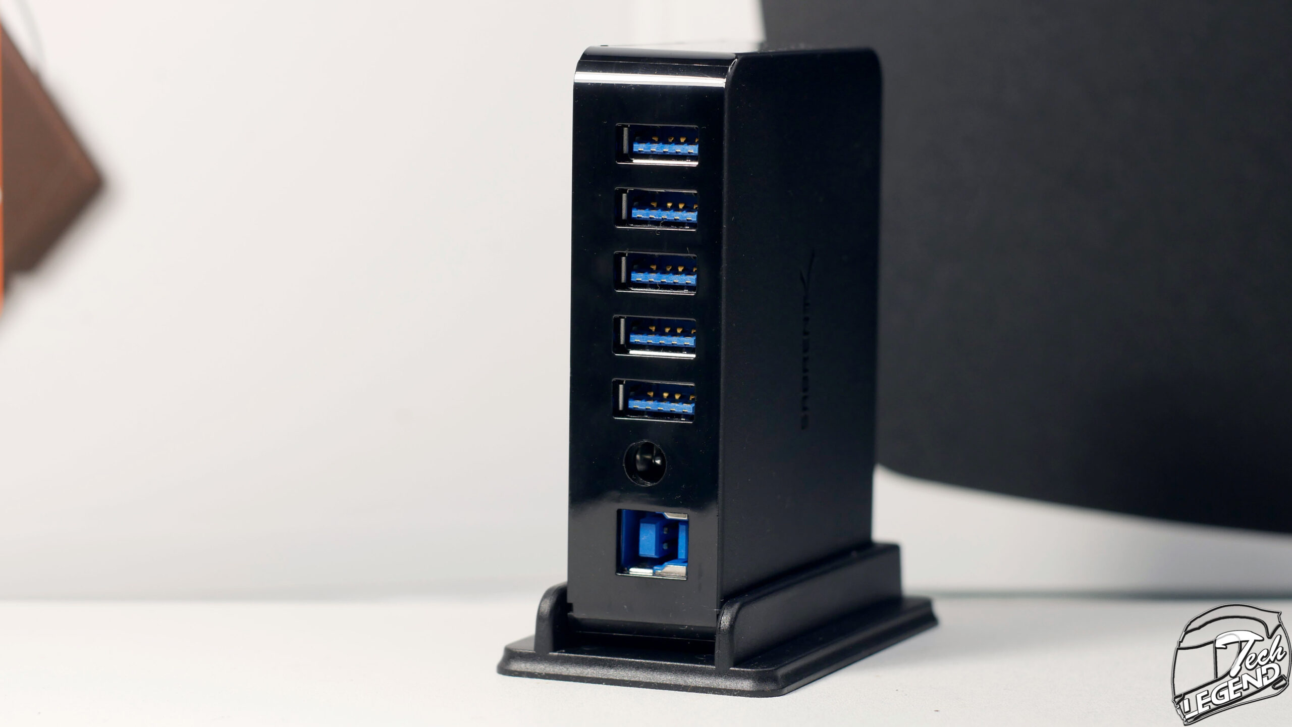 The USB hub has no less than seven data transfer USB 3.0 ports. Two at the front, the blue ones, and five at the back of the unit.