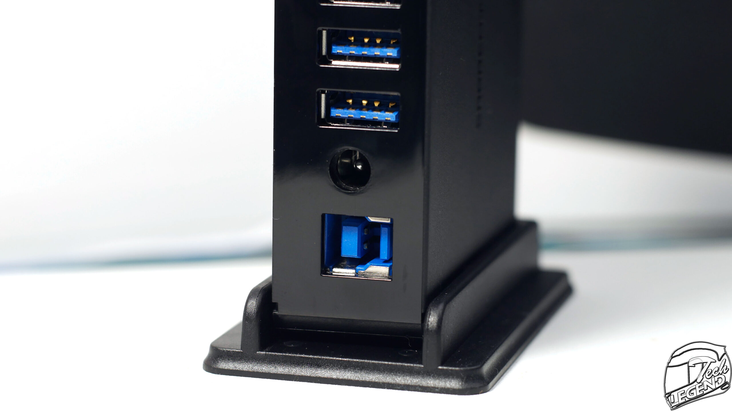 At the back and lower part of the hub you have the main usb transfer port in the shape of a USB Type-B connector and above it you have a round AC power slot and that’s about it for ports.