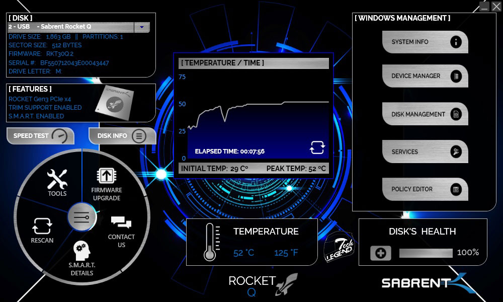 With an ambient temperature of 20°C and under heavy usage, the Sabrent Rocket Q 2TB reached a maximum temperature of 52°C while installed in the EC-SNVE USB-C enclosure.
