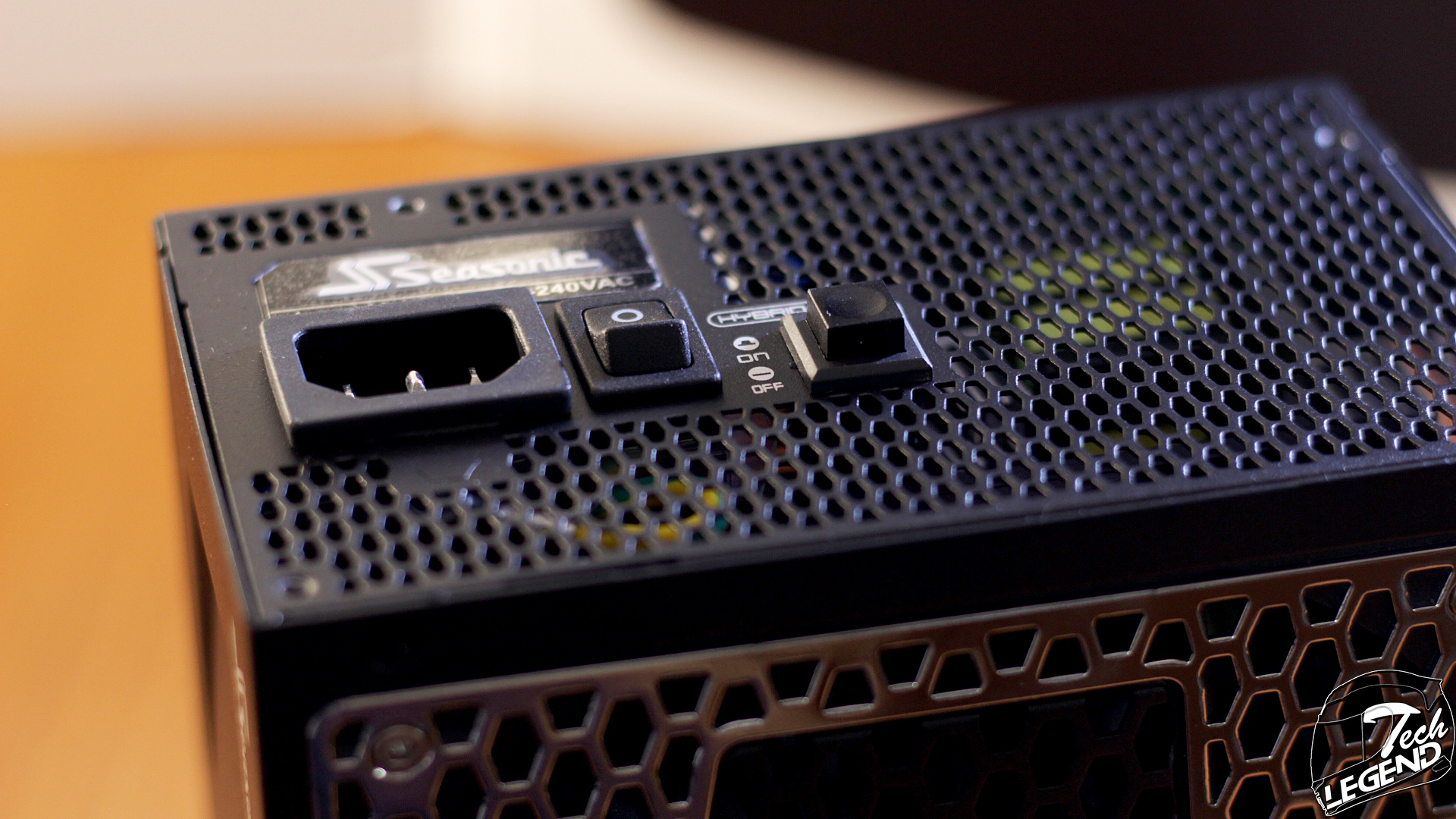 The back of the PRIME TX-750 Titanium has a simple layout, with a widened honeycomb pattern doubling as the exhaust vents of the power supply. The left side features the AC power slot and the ON/OFF button for the fan operating mode, called “Hybrid mode”.