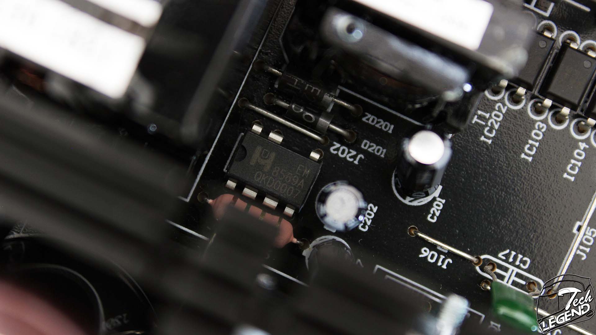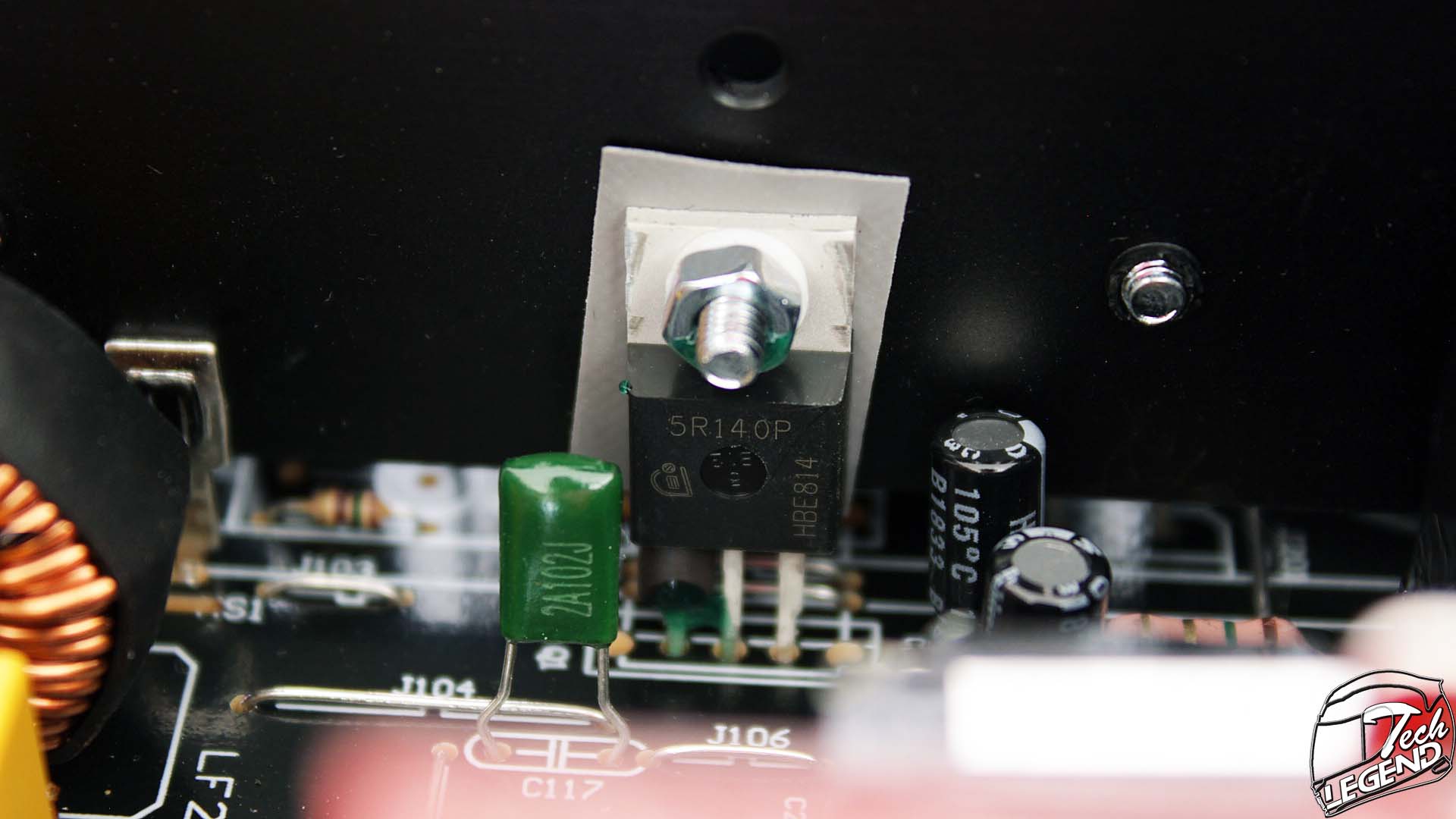 The PFC (power factor correction) side of the PCB features two MOSFETs manufactured by Infineon and with the model number: IPP50R140CP. These two are attached to the heatsink and benefit from the direct passive cooling.