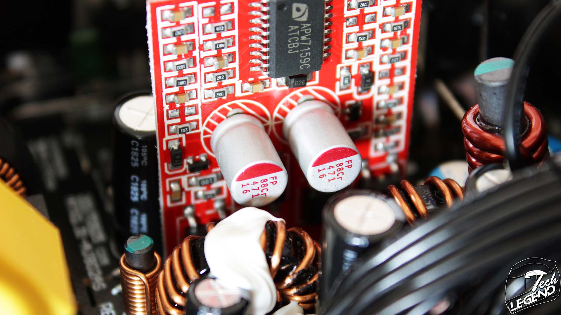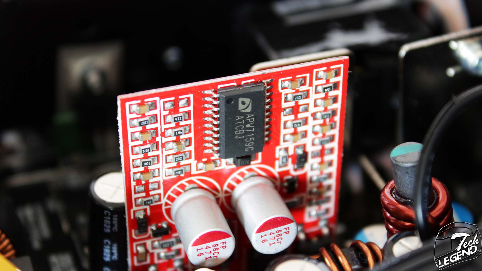 The second PWM Controller is the APW7159C, made by Anpec. It is installed on a secondary vertical PCB, above two polymer capacitors. This PWM controller is responsible with supervising the DC-DC converters for both the +3.3 V and +5 V lines.