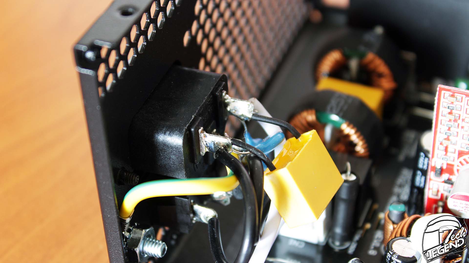 Starting with the filtering at the back of the power supply. There are two ceramic Y-type capacitors and a single X-type capacitor. There is also a white plastic connector that is installed on the PCB making the connection.