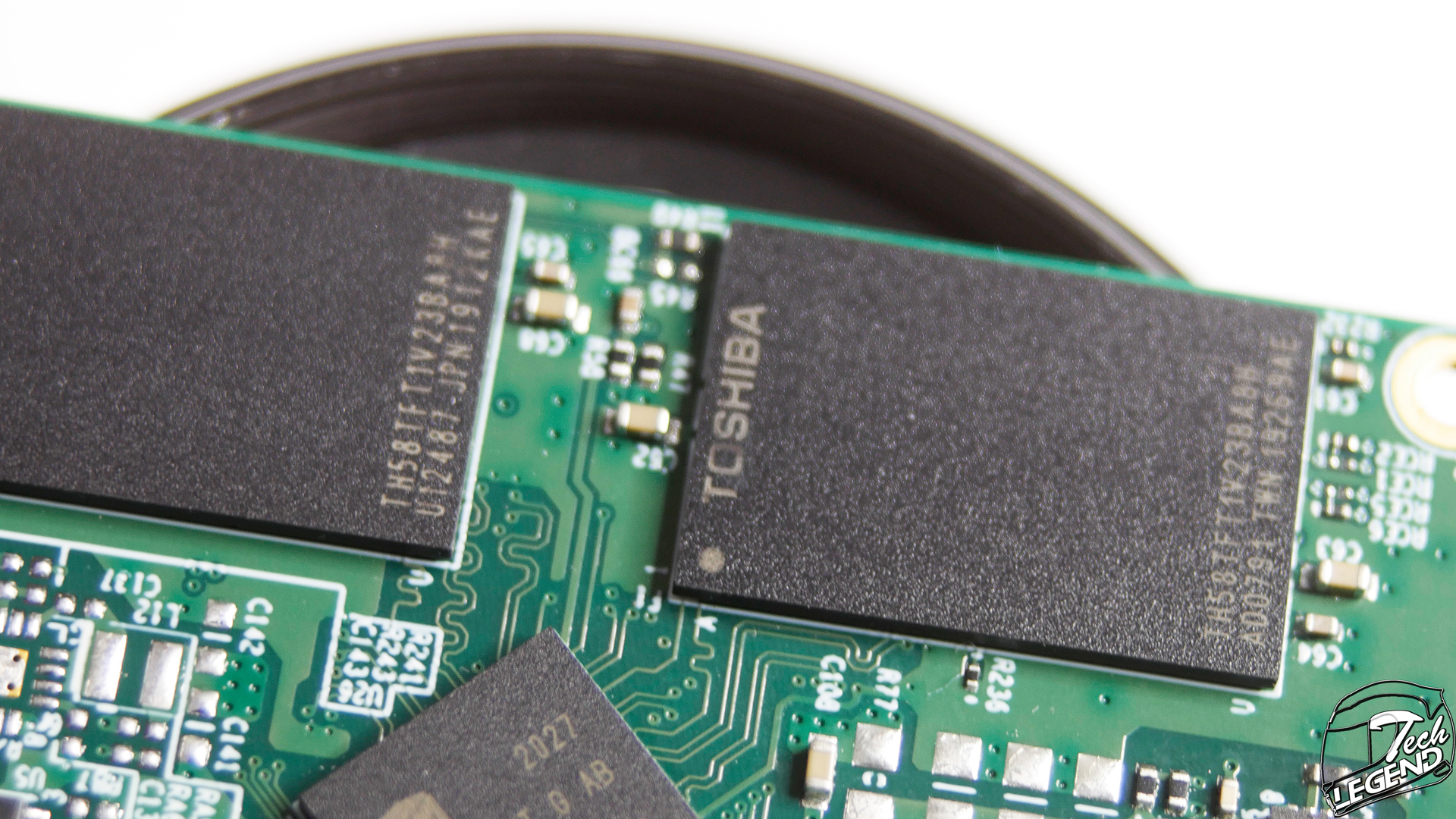 The four memory flash chips installed on this SSD are made by Toshiba/Kioxia and are the 64-Layer TLC type. The part number for the memory chips is: TH58TFT1V23BA8H.