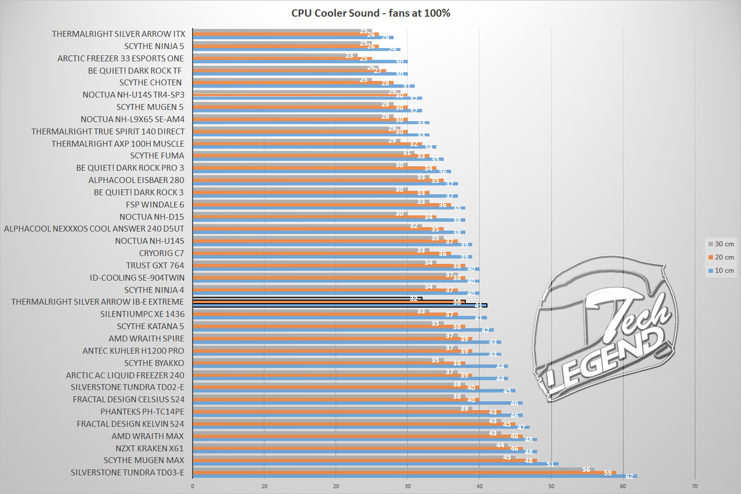 Thanks to the two included fans running at a maximum of 2500RPM, the Silver Arrow IB-E Extreme is not a silent CPU cooler, the sound peaks at around 40 decibels. However, with such a high rotational speed and having two fans installed, a low noise output is hard to achieve.